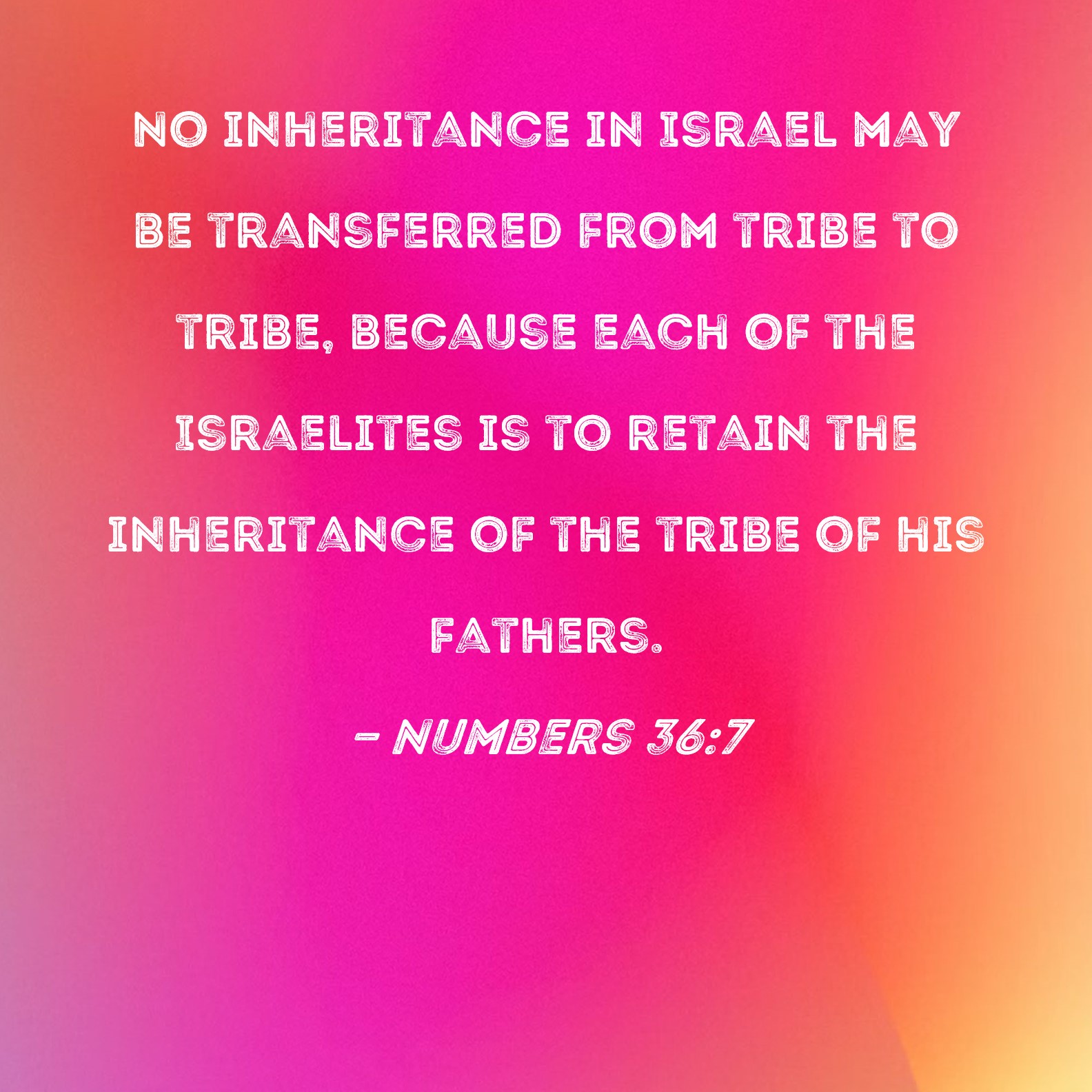 Numbers 36:7 No inheritance in Israel may be transferred from tribe to tribe, because each of the Israelites is to retain the inheritance of the tribe of his fathers.