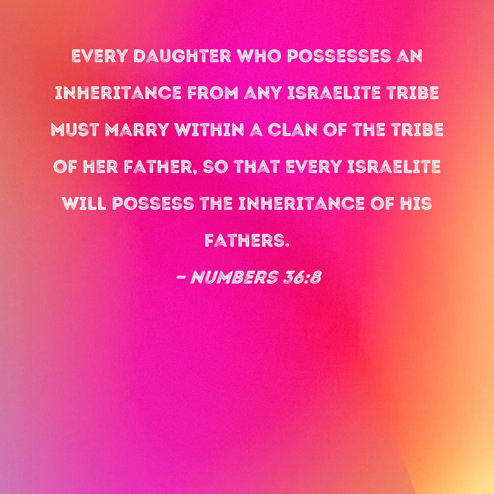 Numbers 36:8 Every daughter who possesses an inheritance from any Israelite tribe must marry within a clan of the tribe of her father, so that every Israelite will possess the inheritance of his fathers.