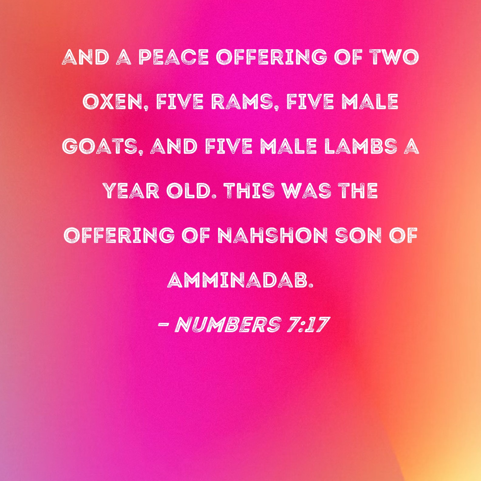 Numbers 7:17 and a peace offering of two oxen, five rams, five male goats, and five male lambs a year old. This was the offering of Nahshon son of Amminadab.