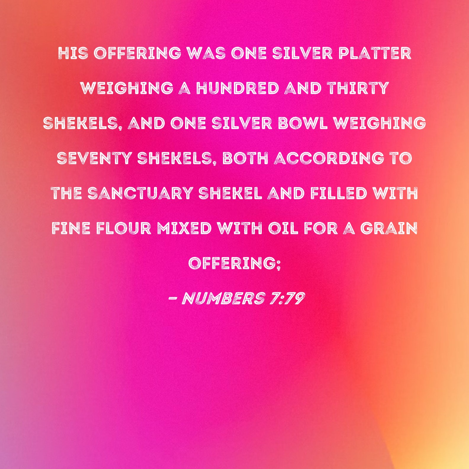Numbers 7:79 His offering was one silver platter weighing a hundred and thirty shekels, and one silver bowl weighing seventy shekels, both according to the sanctuary shekel and filled with fine flour mixed with oil for a grain offering;