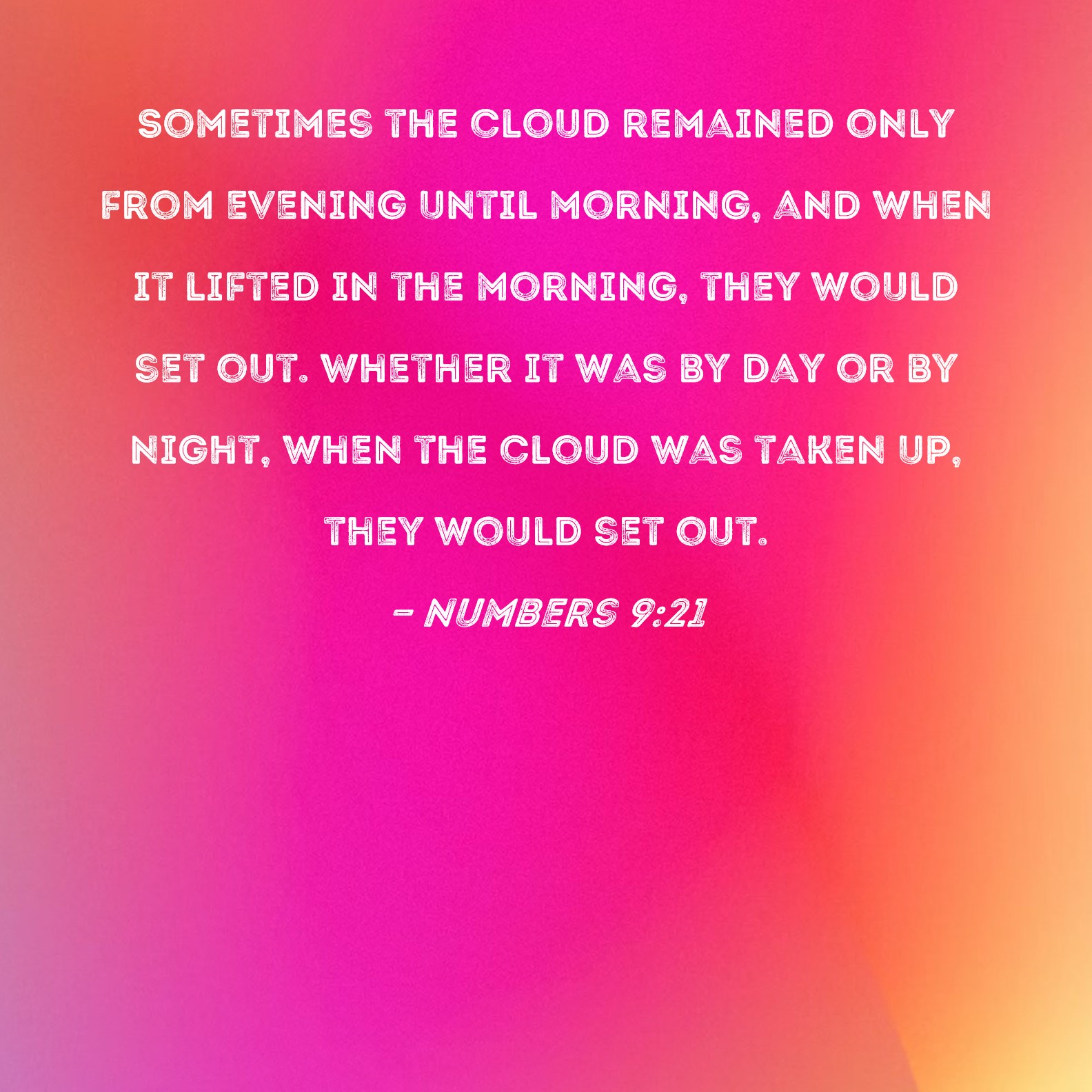 Numbers 9:21 Sometimes the cloud remained only from evening until morning, and when it lifted in the morning, they would set out. Whether it was by day or by night, when the cloud was taken up, they would set out.