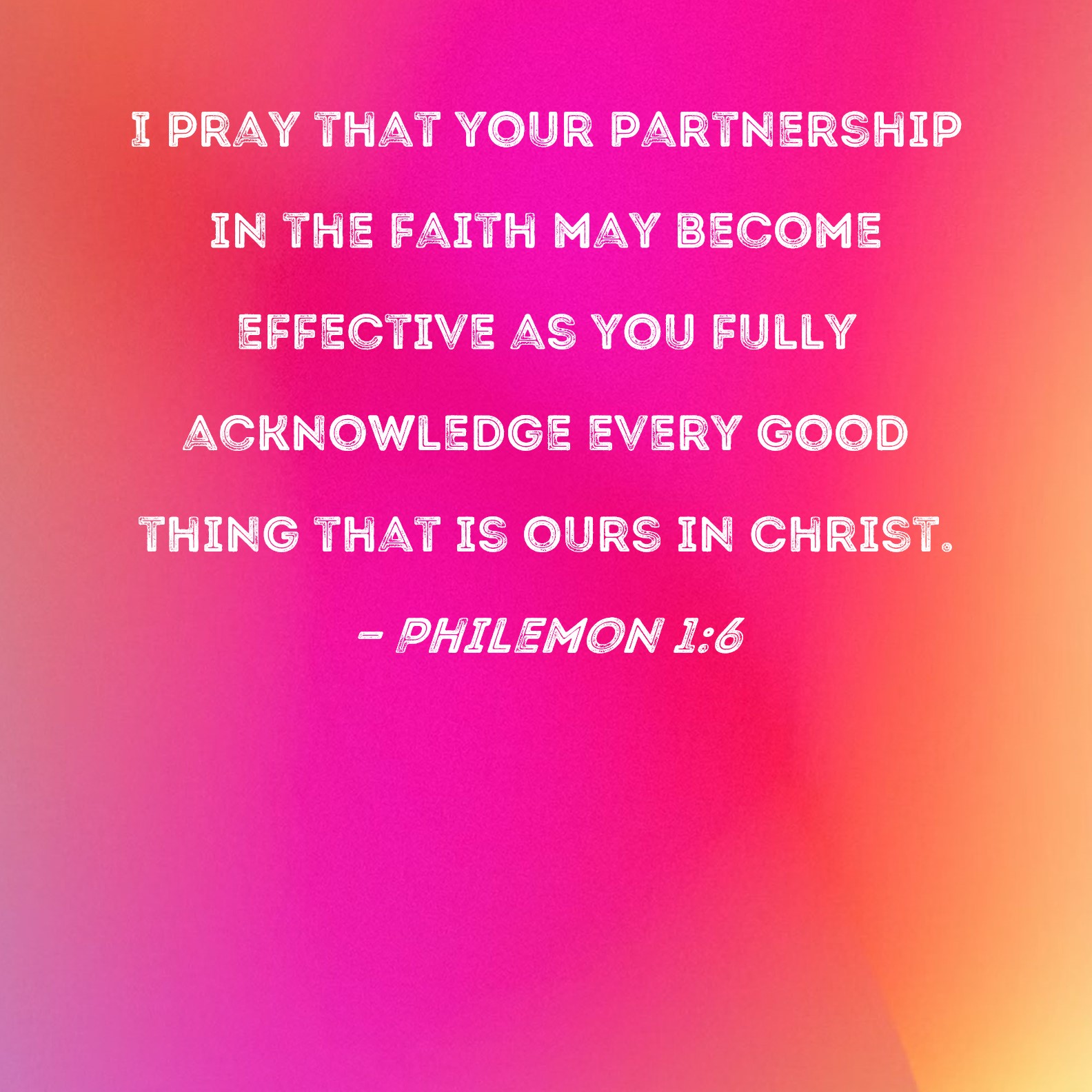 Philemon 1:6 I pray that your partnership in the faith may become effective as you fully acknowledge every good thing that is ours in Christ.