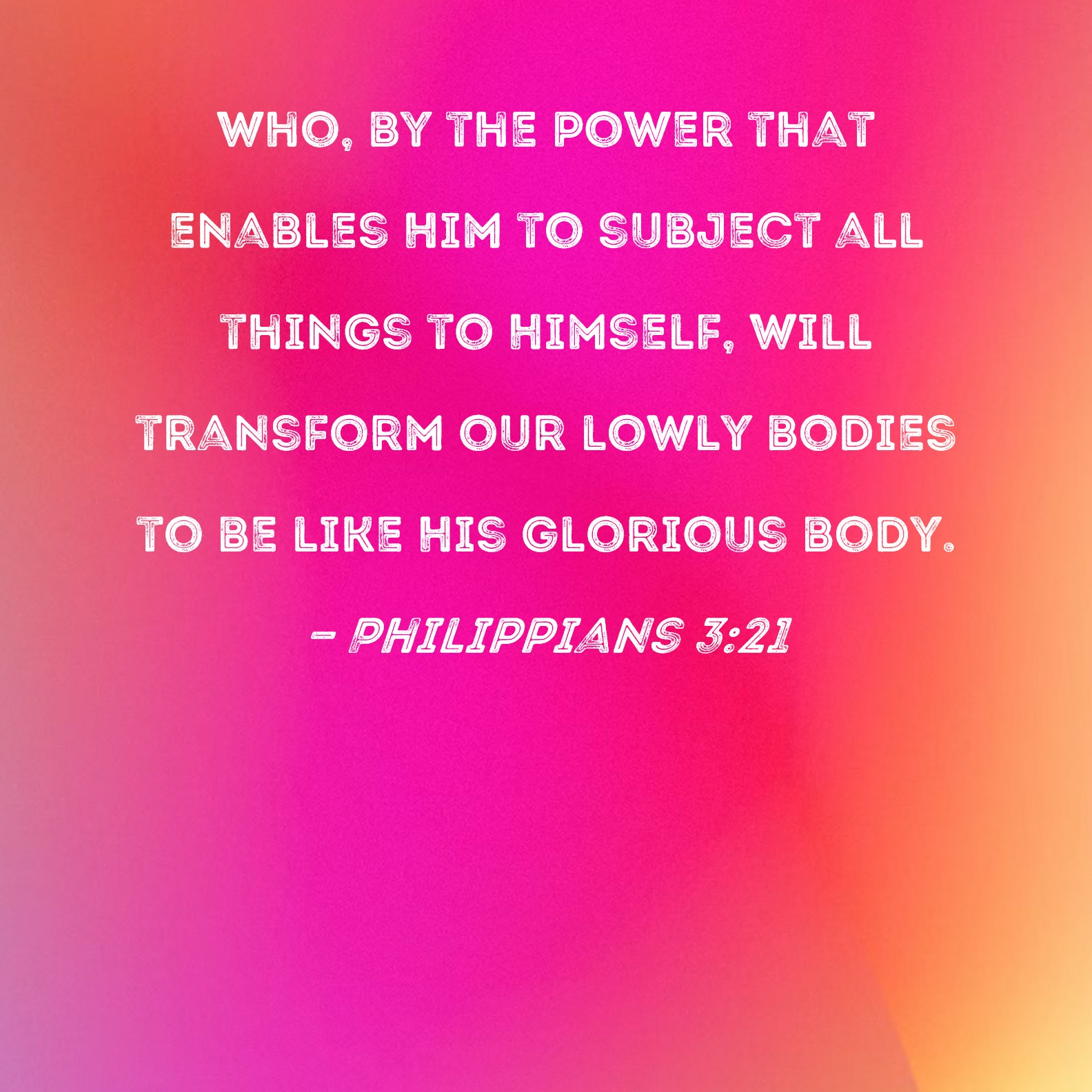Philippians 3:21 who, by the power that enables Him to subject all things to Himself, will transform our lowly bodies to be like His glorious body.