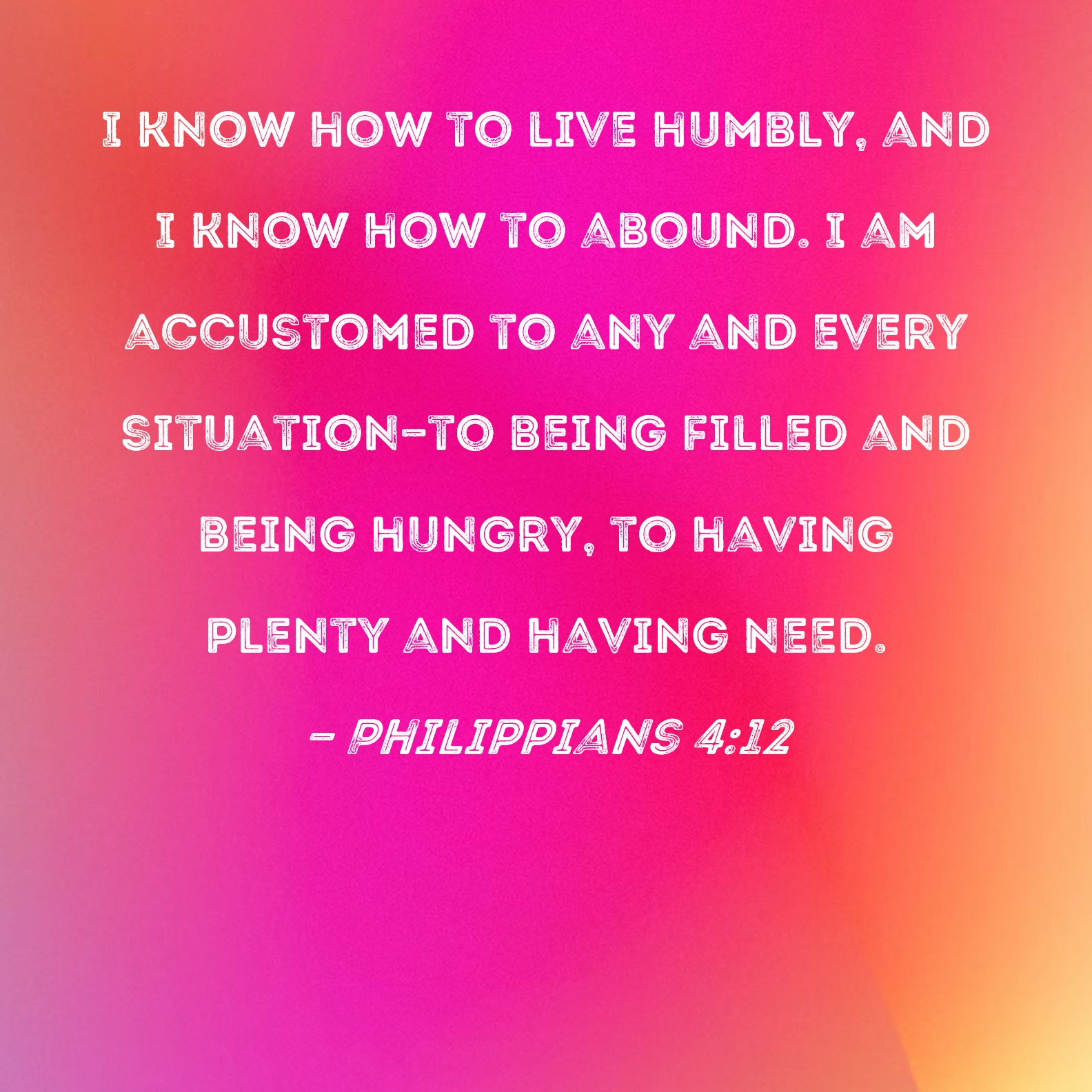 Philippians 4:12 I know how to live humbly, and I know how to abound. I am accustomed to any and every situation--to being filled and being hungry, to having plenty and having need.