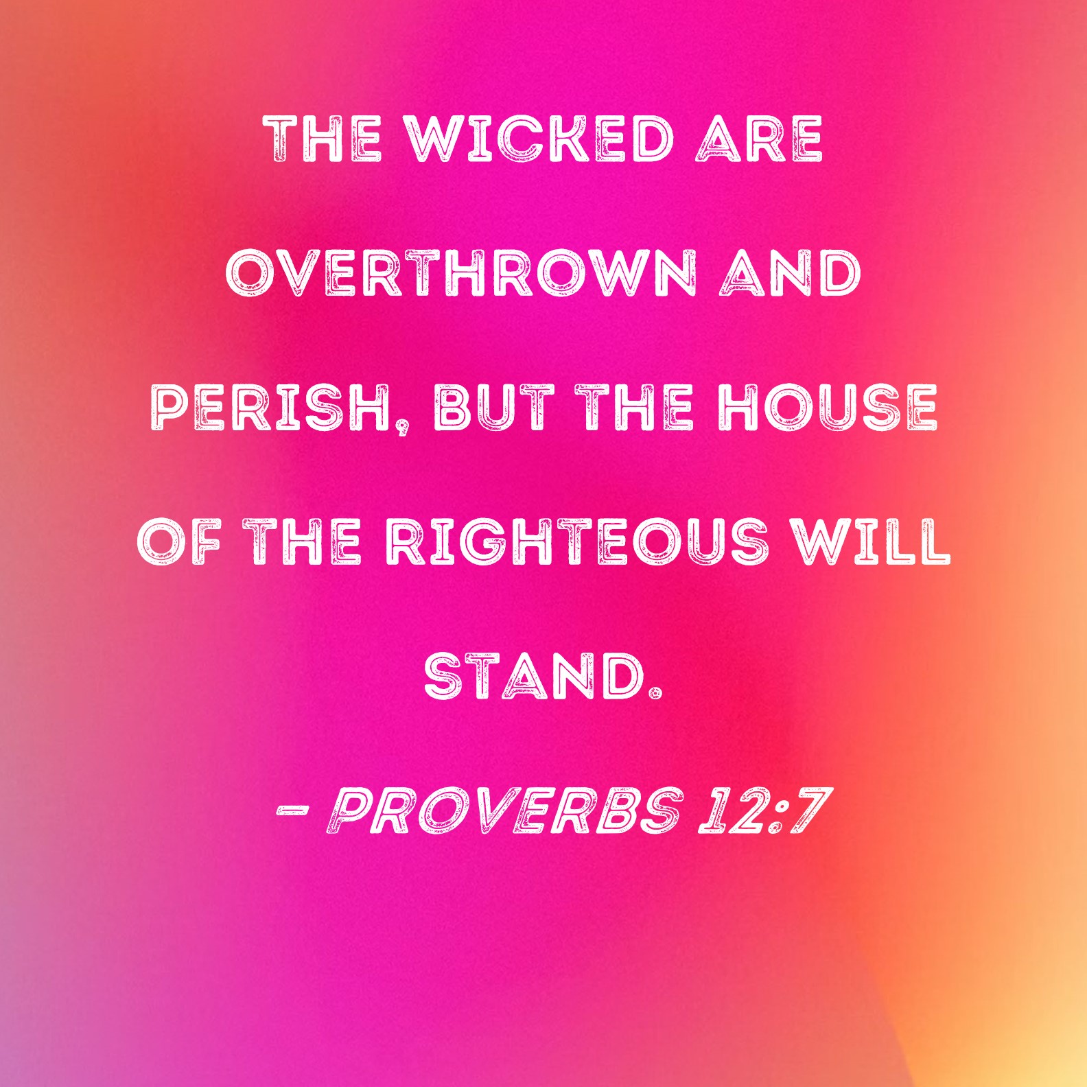 BSB: The wicked are overthrown and perish, but the house of the righteous will stand. KJV: The wicked are overthrown, and are not: but the house of the righteous shall stand. DRB: Turn the wicked, and they shall not be: but the house of the just shall stand firm. DBT: Overthrow the wicked, and they are no more; but the house of the righteous shall stand. ERV: The wicked are overthrown, and are not: but the house of the righteous shall stand. WBT: The wicked are overthrown, and are not: but the house of the righteous shall stand. WEB: The wicked are overthrown, and are no more, but the house of the righteous shall stand. YLT: Overthrow the wicked, and they are not, And the house of the righteous standeth.Links Proverbs 12:7 NIV • Proverbs 12:7 NLT • Proverbs 12:7 ESV • Proverbs 12:7 NASB • Proverbs 12:7 KJV • Proverbs 12:7 Interlinear • Proverbs 12:7 Commentaries • Proverbs 12:7 Parallel Texts • Proverbs 12:7 Bible Apps • Proverbs 12:7 Parallel • Bible Hub |