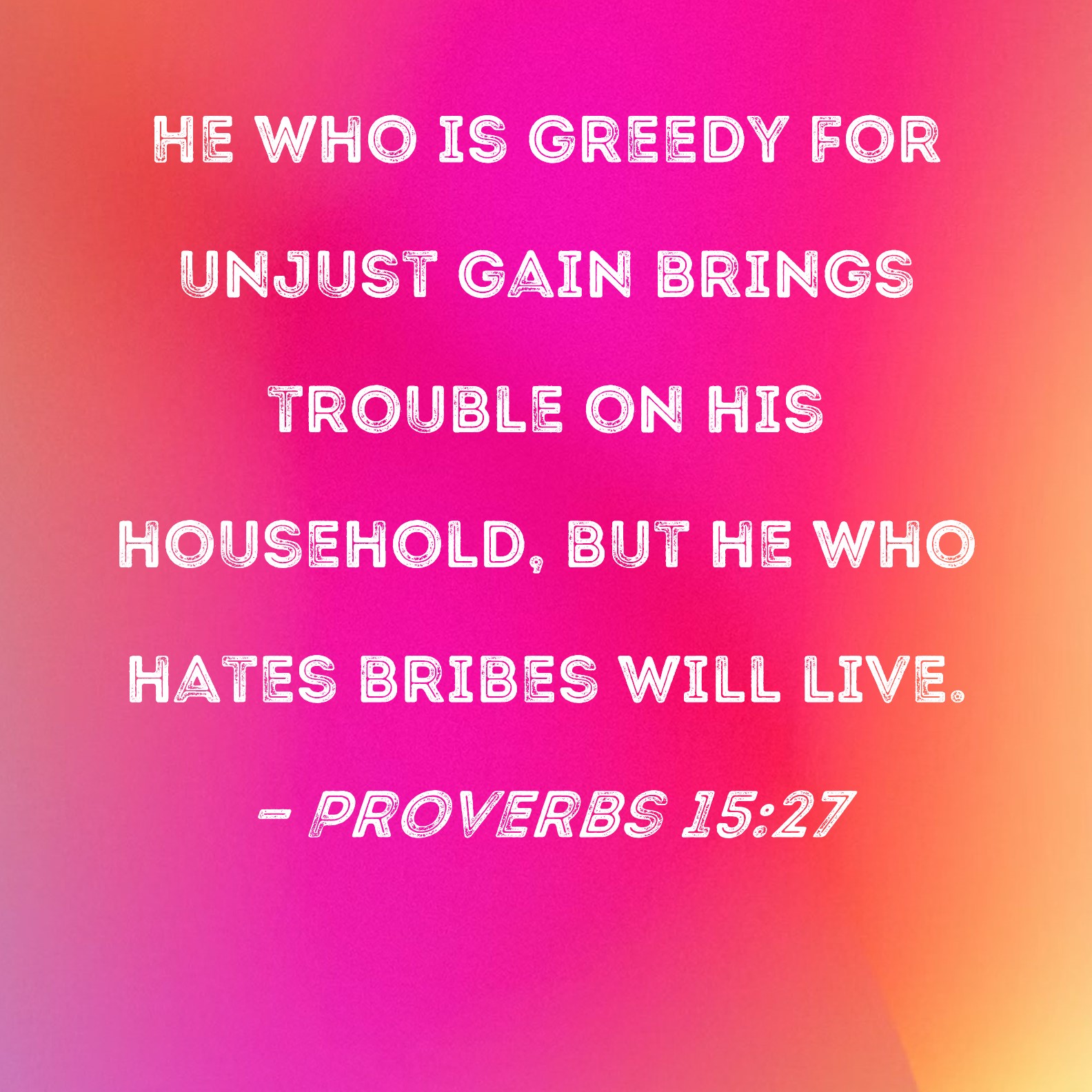 Proverbs 15:27 He who is greedy for unjust gain brings trouble on his household, but he who hates bribes will live.