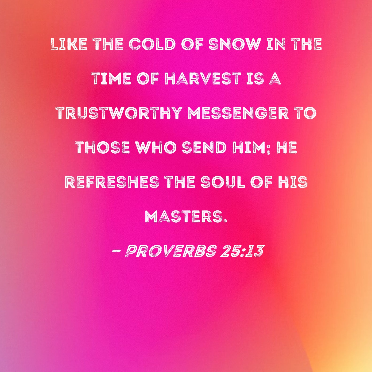 Proverbs 25:13 Like the cold of snow in the time of harvest is a trustworthy messenger to those who send him; he refreshes the soul of his masters.