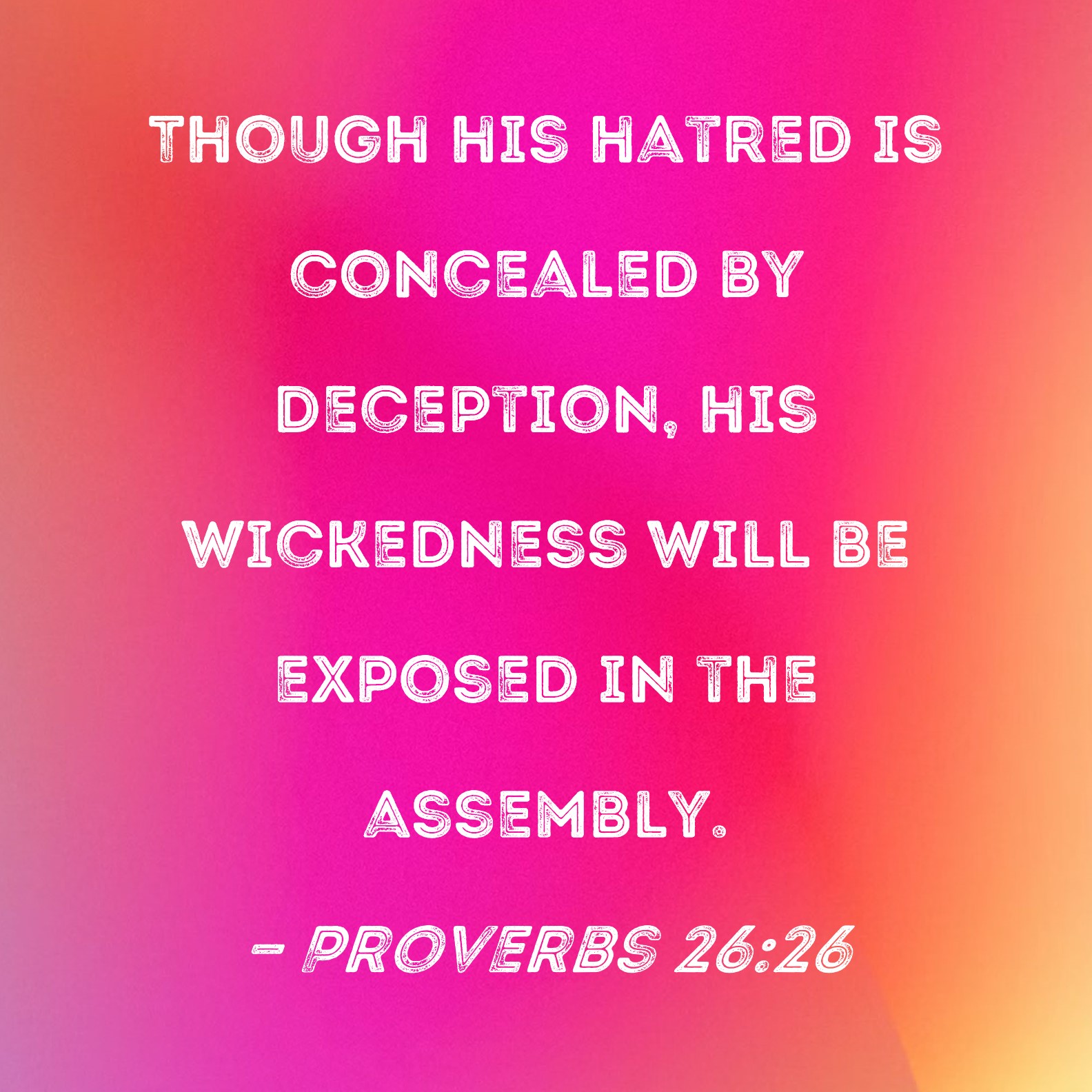 Proverbs 26:26 Though his hatred is concealed by deception, his wickedness will be exposed in the assembly.