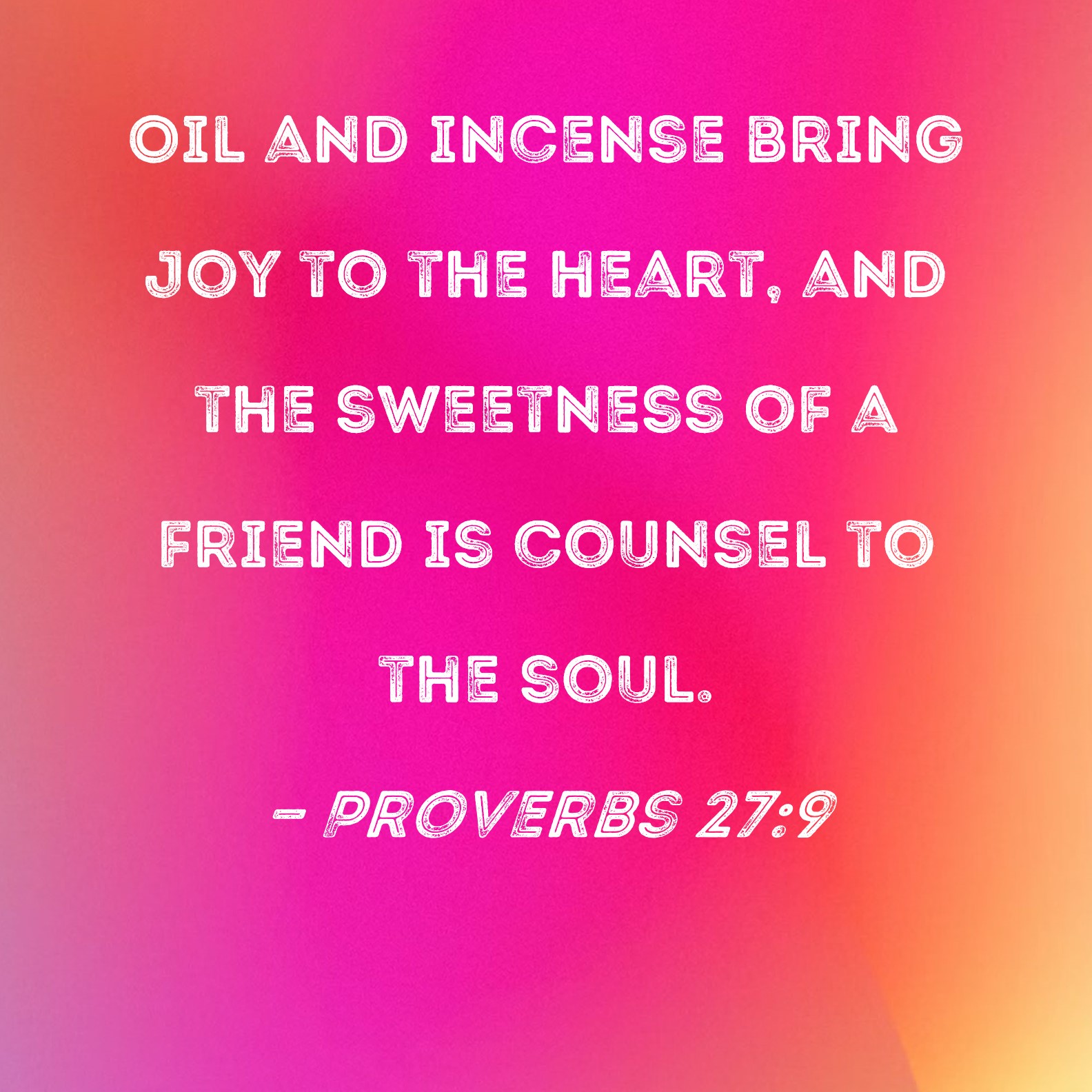 Proverbs 27:9 Oil and incense bring joy to the heart, and the sweetness of a friend is counsel to the soul.