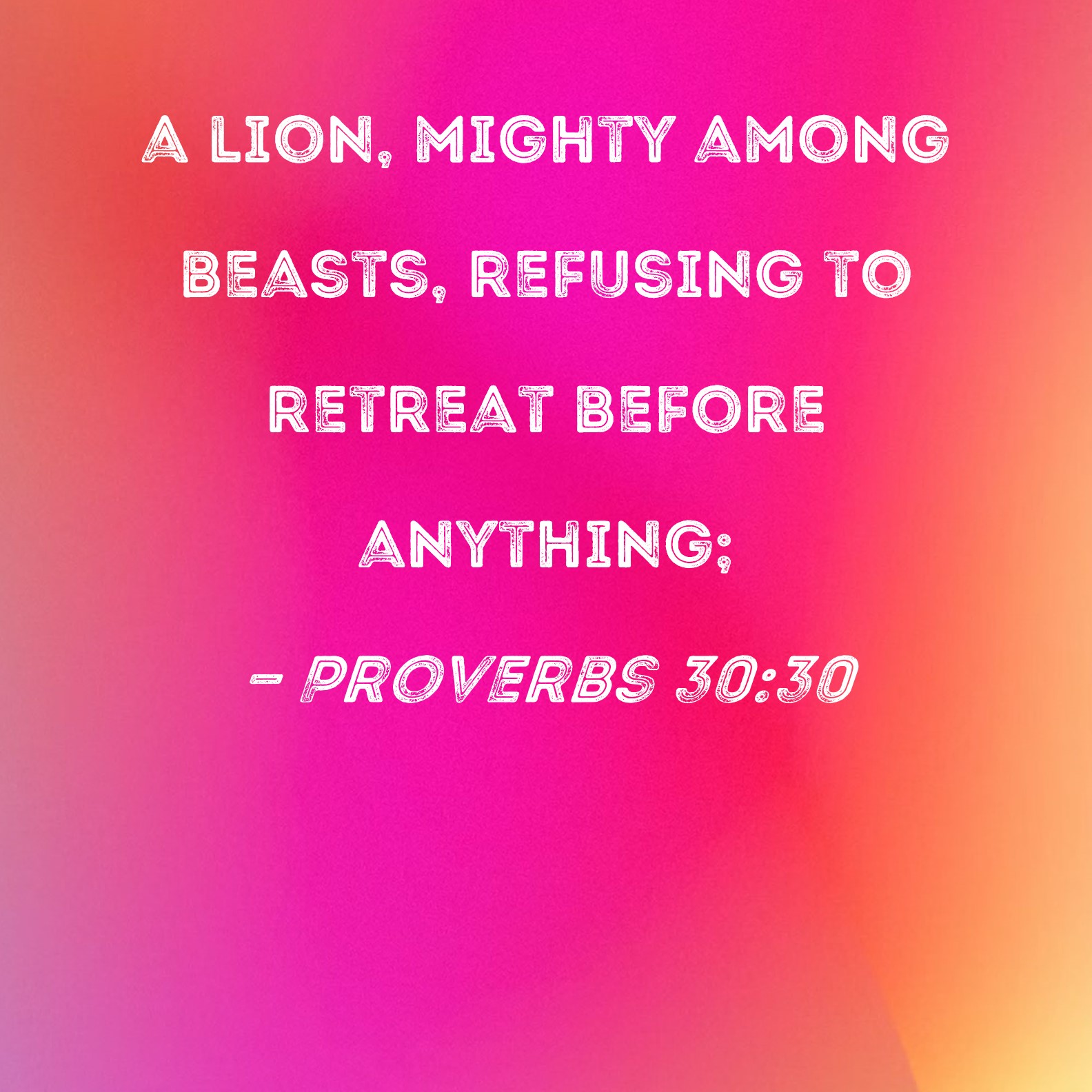 BSB: a lion, mighty among beasts, refusing to retreat before anything; KJV: A lion which is strongest among beasts, and turneth not away for any; DRB: A lion, the strongest of beasts, who hath no fear of any thing he meeteth: DBT: The lion, mighty among beasts, which turneth not away for any; ERV: The lion, which is mightiest among beasts, and turneth not away for any; WBT: A lion, which is strongest among beasts, and turneth not away for any; WEB: The lion, which is mightiest among animals, and doesn’t turn away for any; YLT: An old lion — mighty among beasts, That turneth not back from the face of any,Links Proverbs 30:30 NIV • Proverbs 30:30 NLT • Proverbs 30:30 ESV • Proverbs 30:30 NASB • Proverbs 30:30 KJV • Proverbs 30:30 Interlinear • Proverbs 30:30 Commentaries • Proverbs 30:30 Parallel Texts • Proverbs 30:30 Bible Apps • Proverbs 30:30 Parallel • Bible Hub |