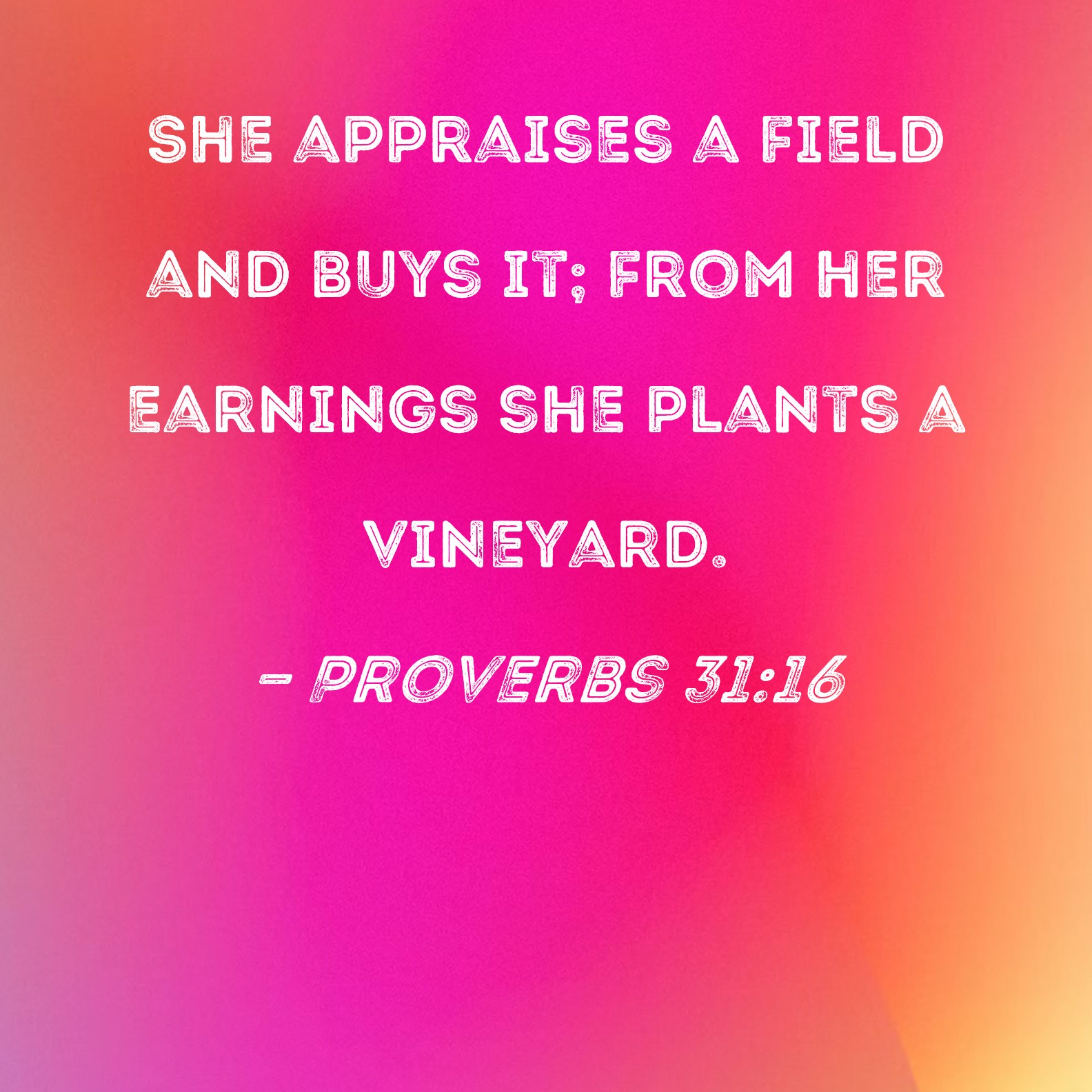 Proverbs 31:16 She appraises a field and buys it; from her earnings she plants a vineyard.