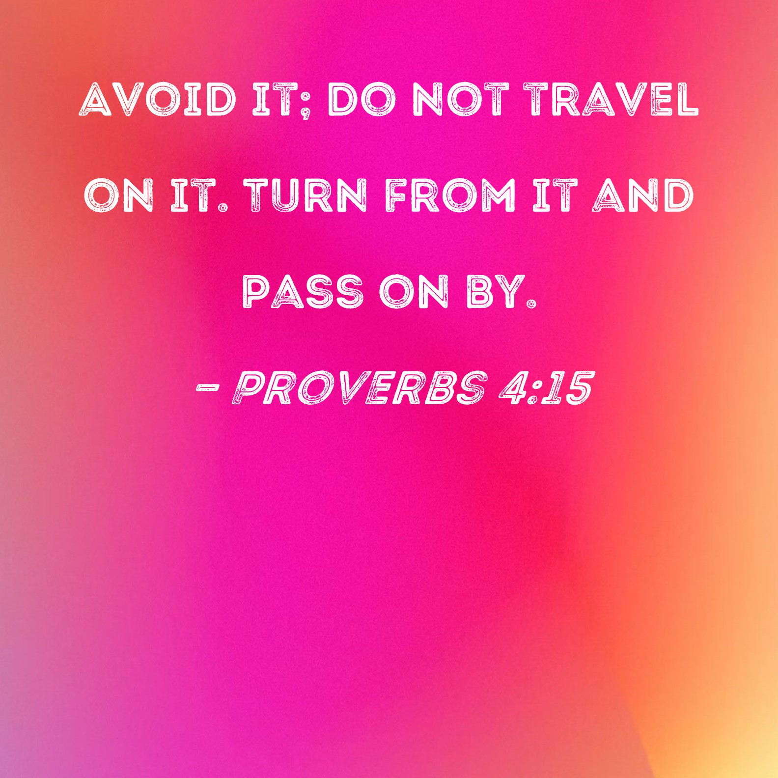 BSB: Avoid it; do not travel on it. Turn from it and pass on by. KJV: Avoid it, pass not by it, turn from it, and pass away. DRB: Flee from it, pass not by it: go aside, and forsake it. DBT: avoid it, pass not by it; turn from it, and pass away. ERV: Avoid it, pass not by it; turn from it, and pass on. WBT: Avoid it, pass not by it, turn from it, and pass away. WEB: Avoid it, and don’t pass by it. Turn from it, and pass on. YLT: Avoid it, pass not over into it, Turn aside from it, and pass on.Links Proverbs 4:15 NIV • Proverbs 4:15 NLT • Proverbs 4:15 ESV • Proverbs 4:15 NASB • Proverbs 4:15 KJV • Proverbs 4:15 Interlinear • Proverbs 4:15 Commentaries • Proverbs 4:15 Parallel Texts • Proverbs 4:15 Bible Apps • Proverbs 4:15 Parallel • Bible Hub |