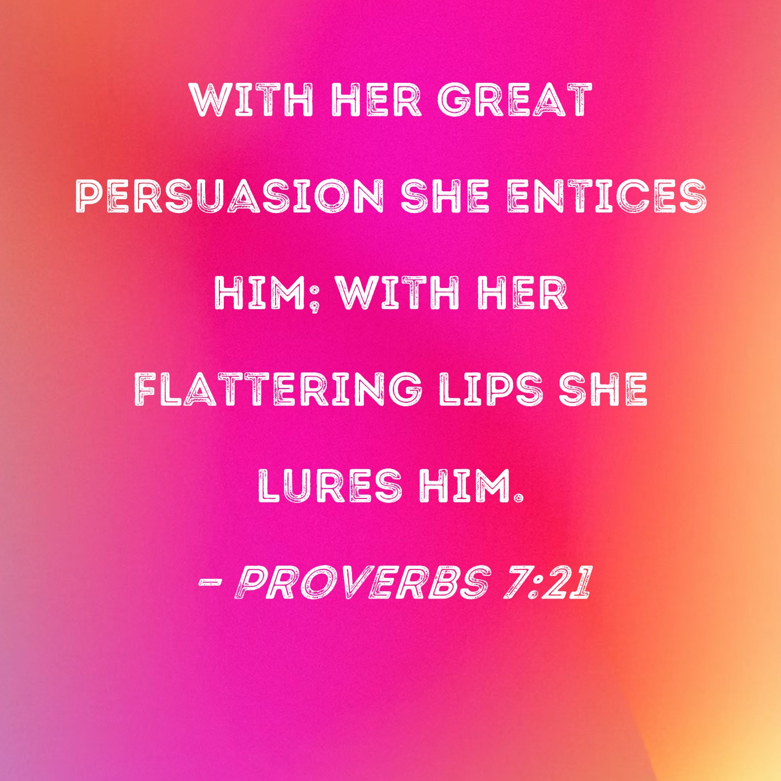 Proverbs 7:21 With her great persuasion she entices him; with her flattering lips she lures him.