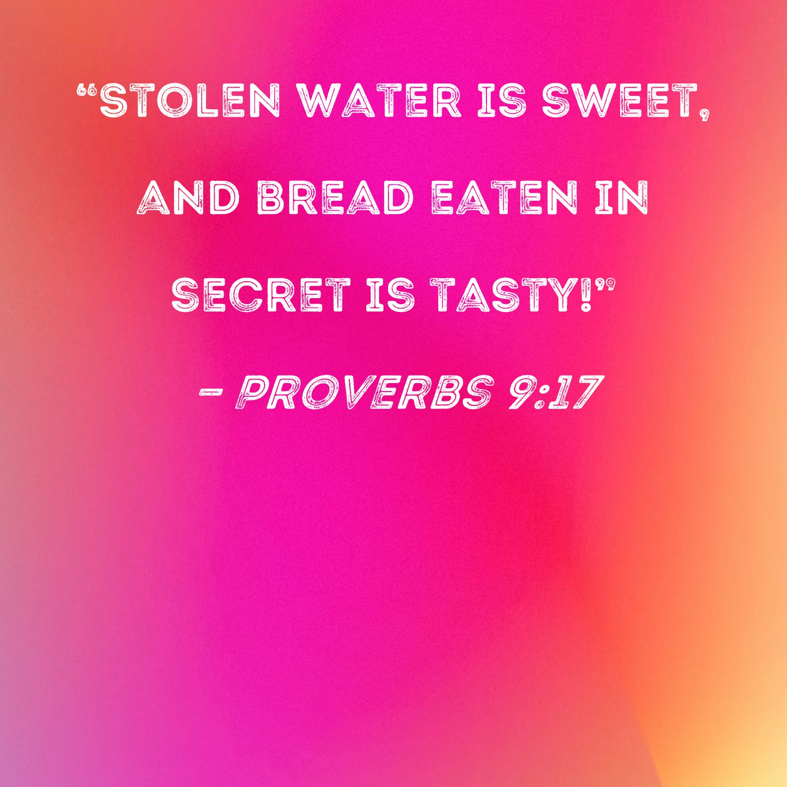 Proverbs 9:17 "Stolen water is sweet, and bread eaten in secret is tasty!"