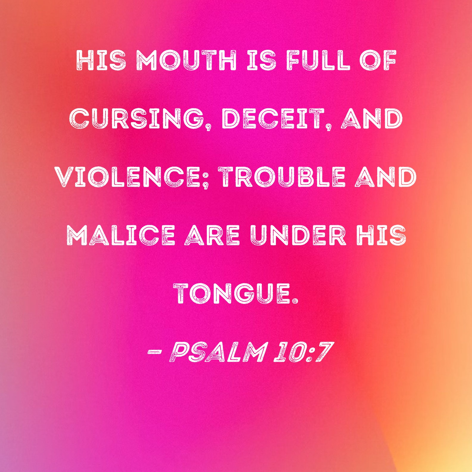 Psalm 10:7 His mouth is full of cursing, deceit, and violence; trouble and malice are under his tongue.