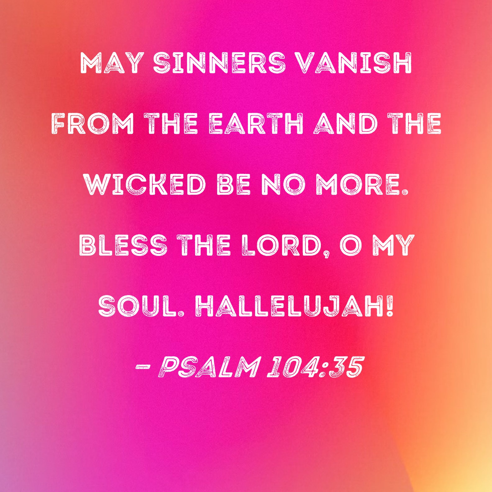 Psalm 104:35 May sinners vanish from the earth and the wicked be no more. Bless the LORD, O my soul. Hallelujah!