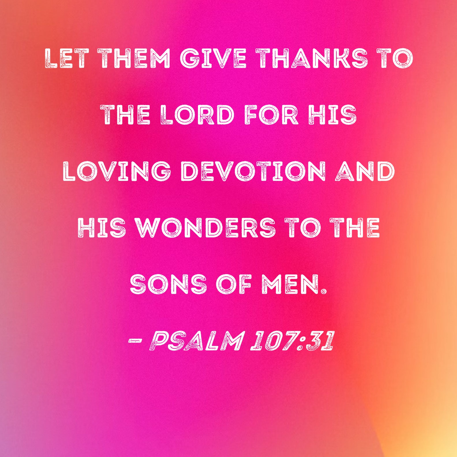Psalm 107:31 Let them give thanks to the LORD for His loving devotion and His wonders to the sons of men.