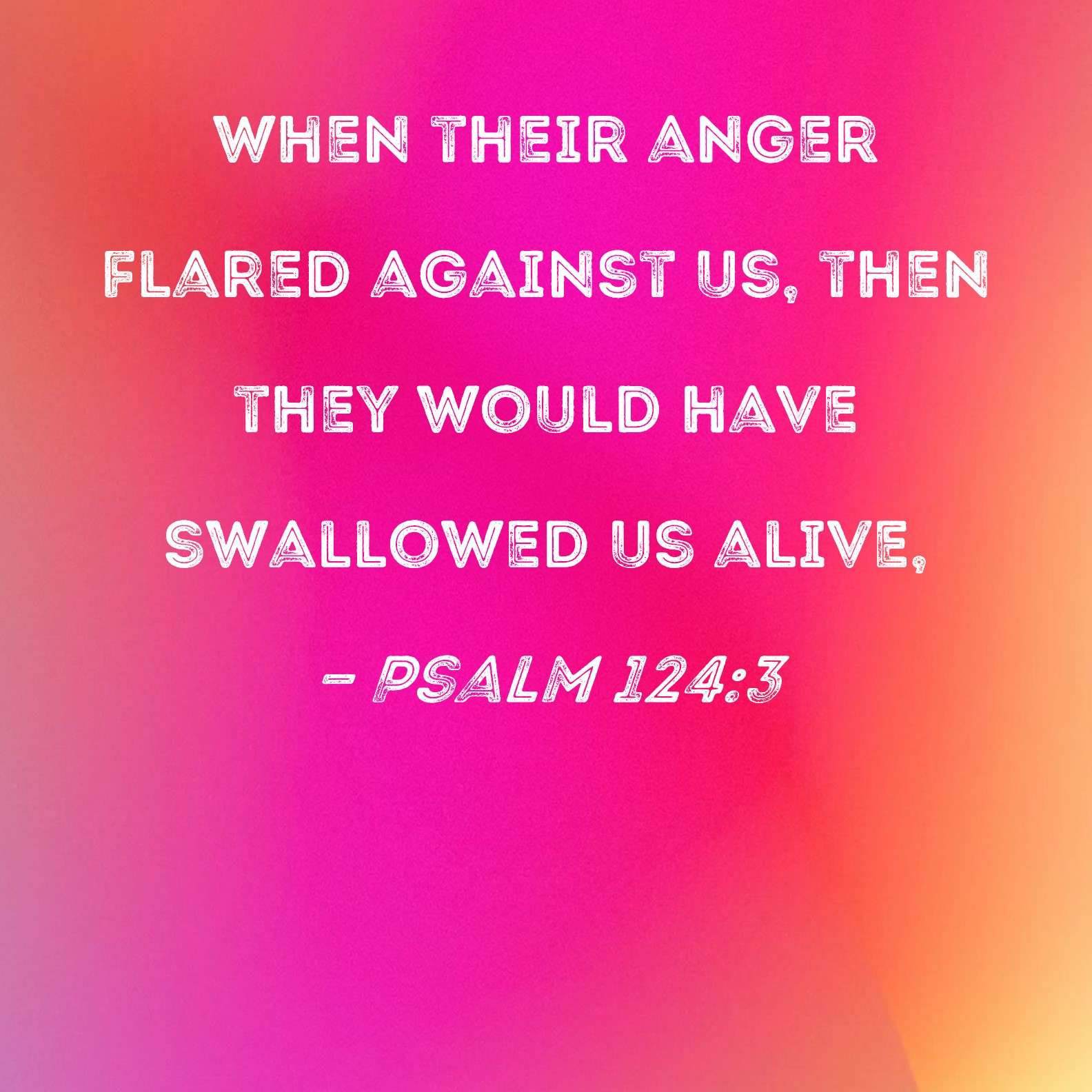 Psalm 124:3 when their anger flared against us, then they would have swallowed us alive,