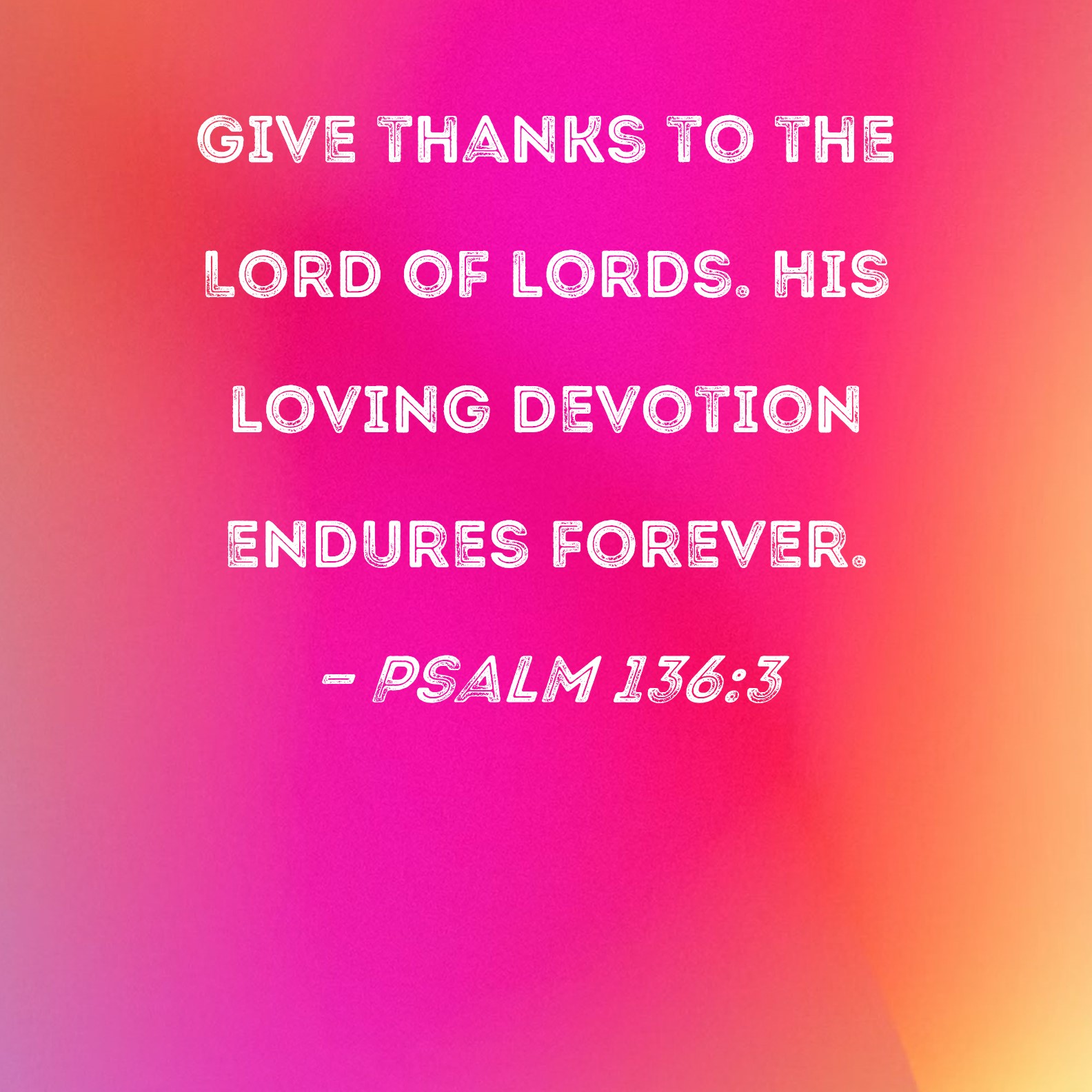 Psalm 136:3 Give thanks to the Lord of lords. His loving devotion endures forever.