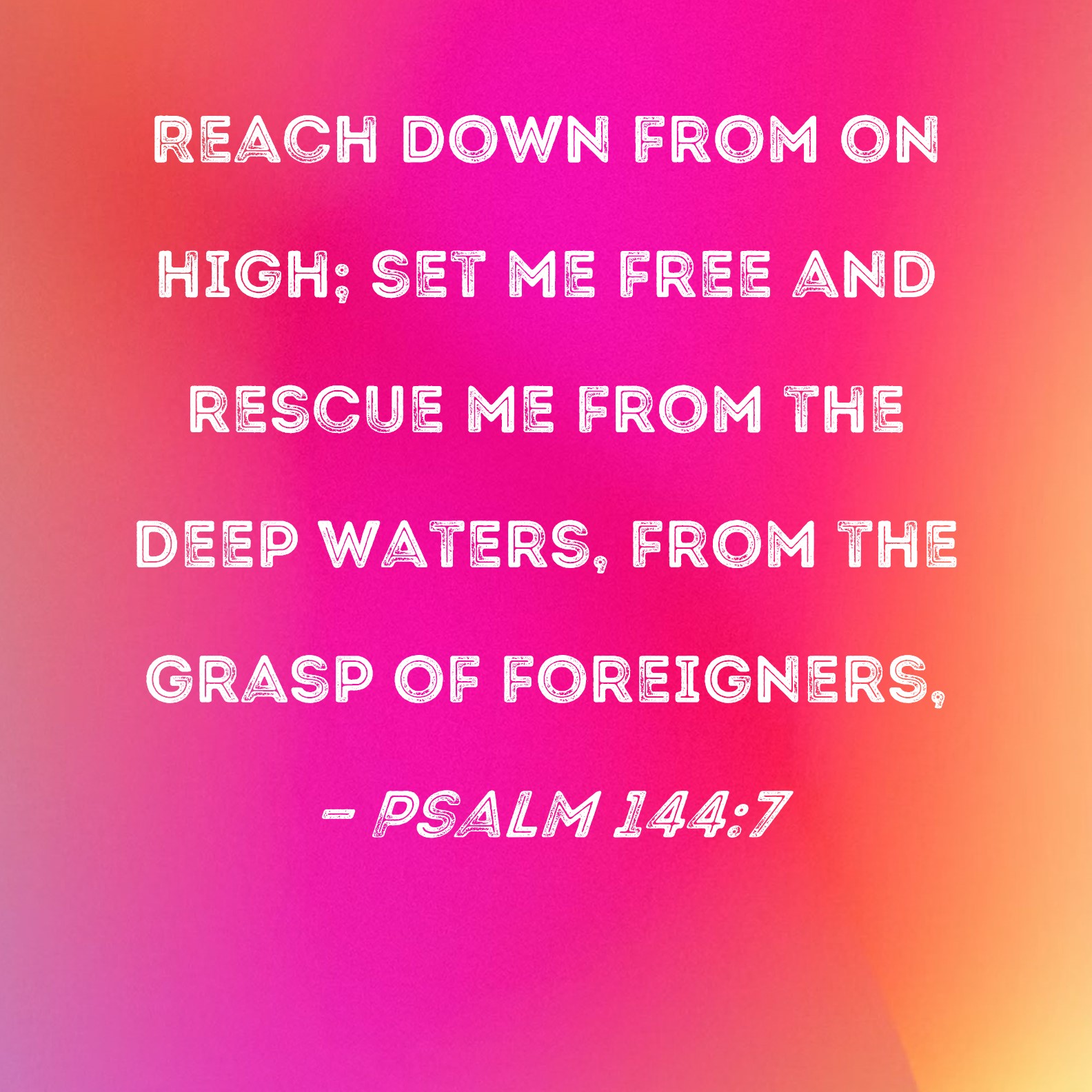 Psalm 144:7 Reach down from on high; set me free and rescue me from the deep waters, from the grasp of foreigners,