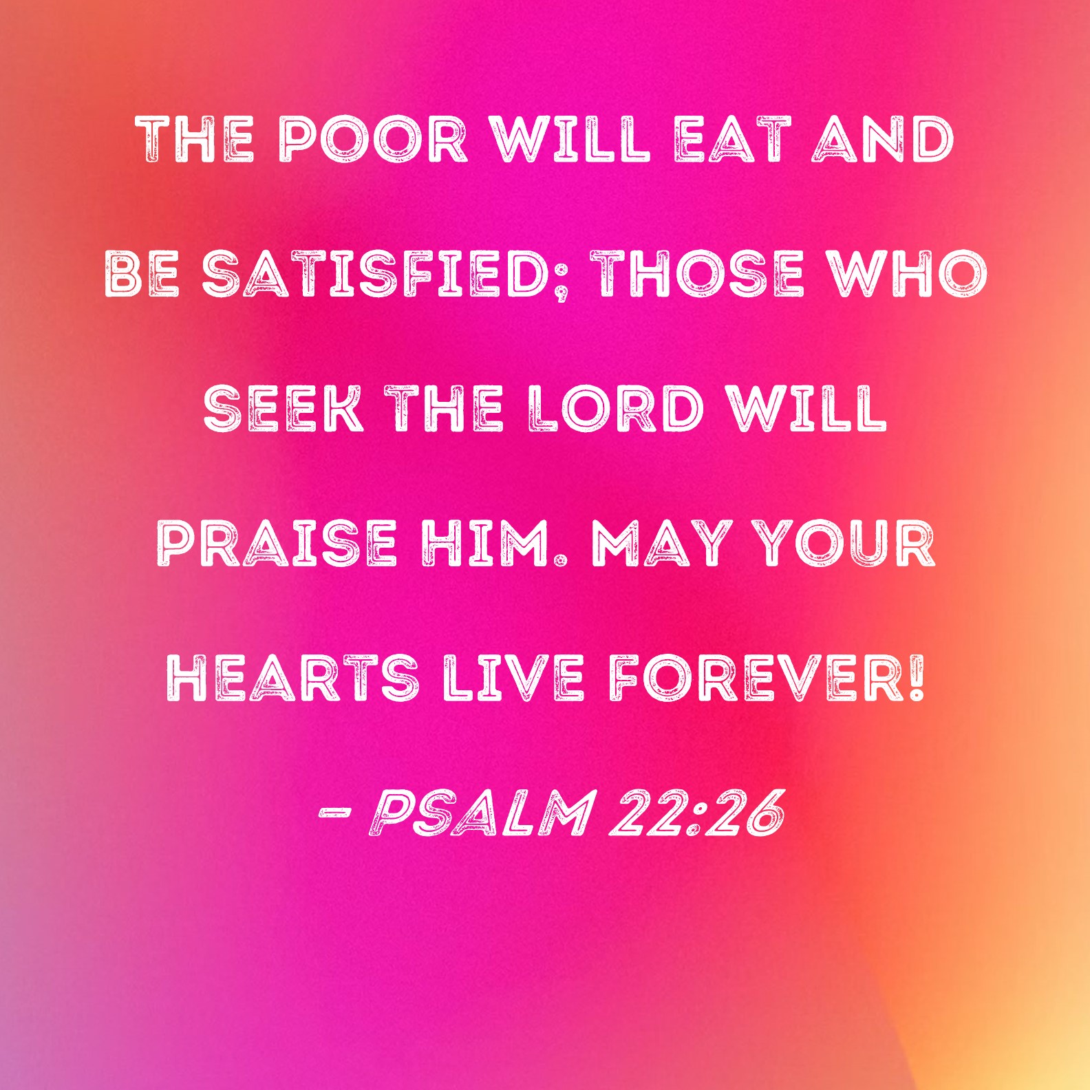 Psalm 22:26 The poor will eat and be satisfied; those who seek the LORD will praise Him. May your hearts live forever!