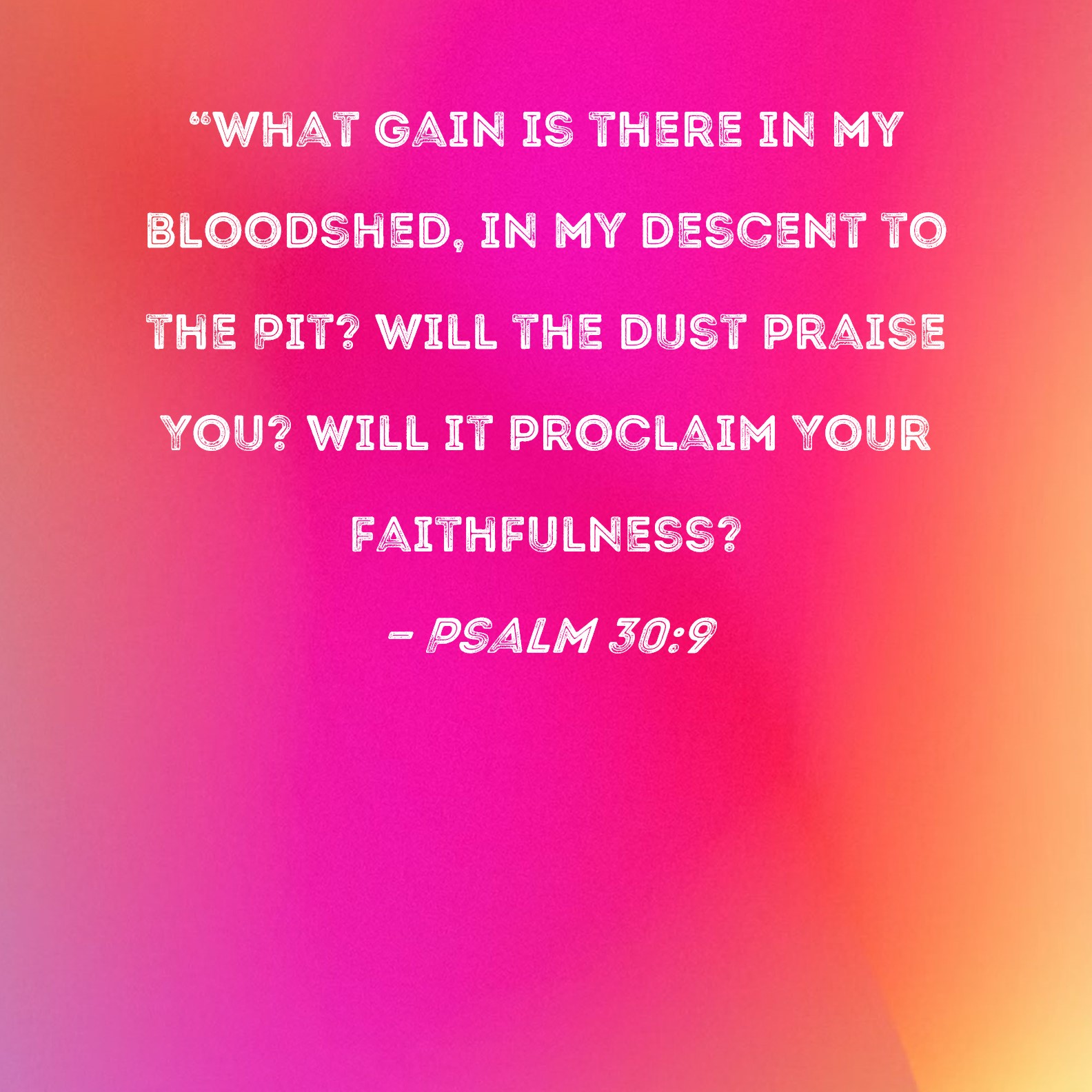Psalm 30:9 "What gain is there in my bloodshed, in my descent to the Pit? Will the dust praise You? Will it proclaim Your faithfulness?