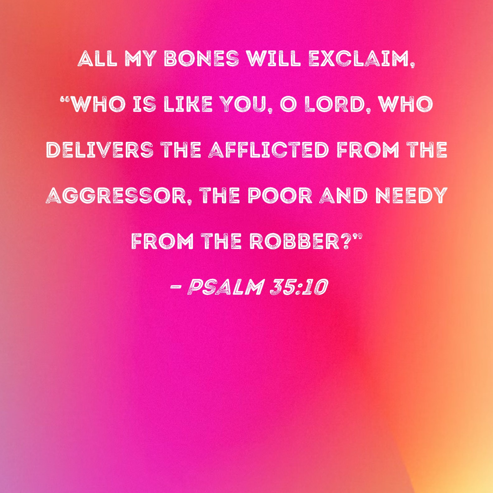 Psalm 35:10 All my bones will exclaim, "Who is like You, O LORD, who delivers the afflicted from the aggressor, the poor and needy from the robber?"