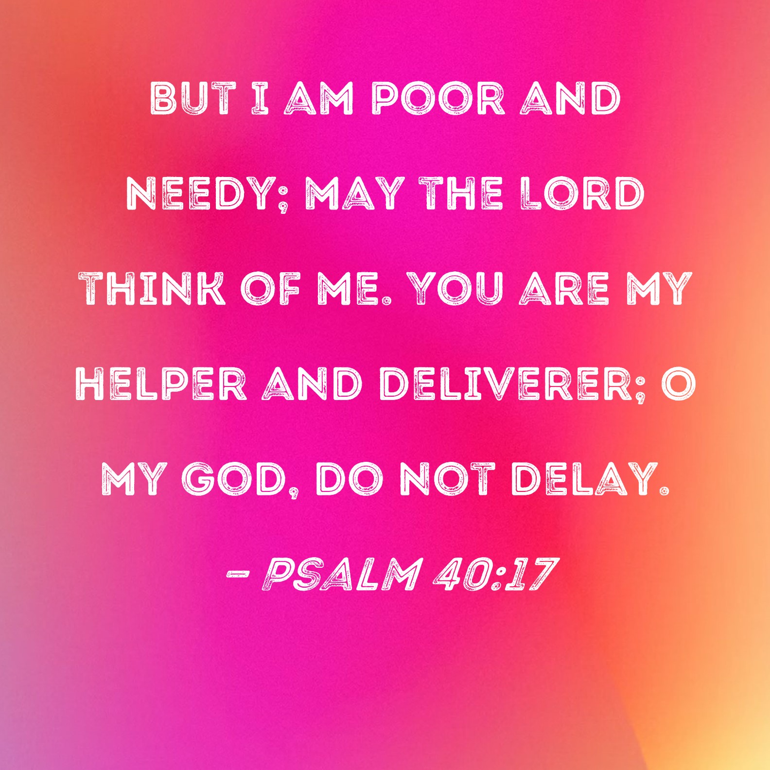 Psalm 40:17 But I am poor and needy; may the Lord think of me. You are my helper and deliverer; O my God, do not delay.
