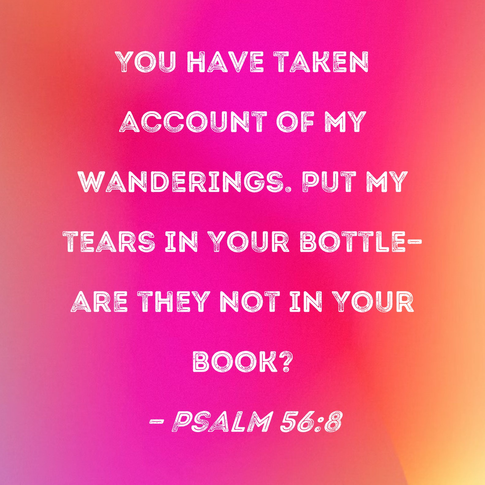 Psalm 56:8 You have taken account of my wanderings. Put my tears in Your bottle--are they not in Your book?