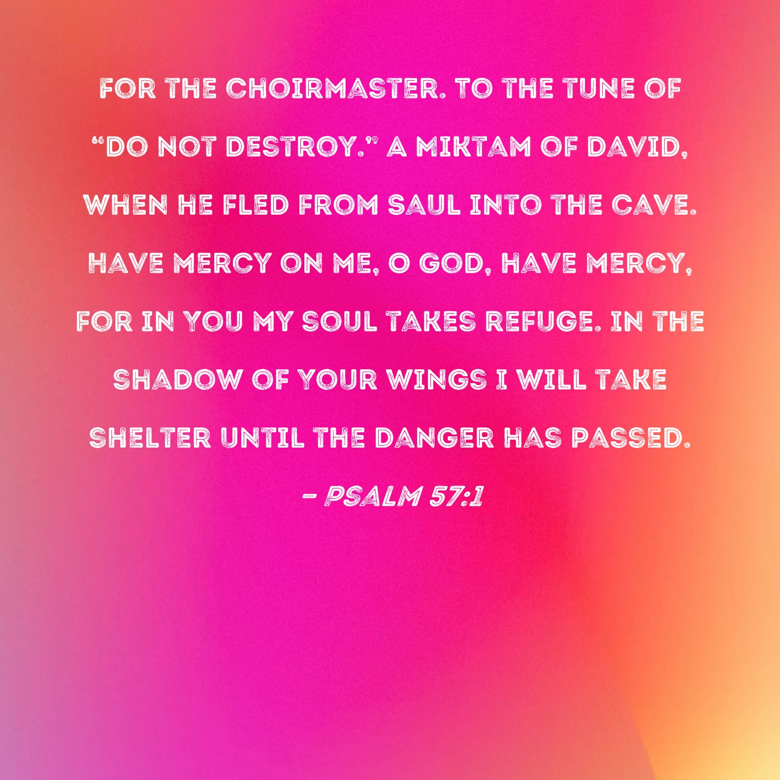 Psalm 57:1 For the choirmaster. To the tune of "Do Not Destroy." A Miktam of David, when he fled from Saul into the cave. Have mercy on me, O God, have mercy, for in You my soul takes refuge. In the shadow of Your wings I will take shelter until the danger has passed.