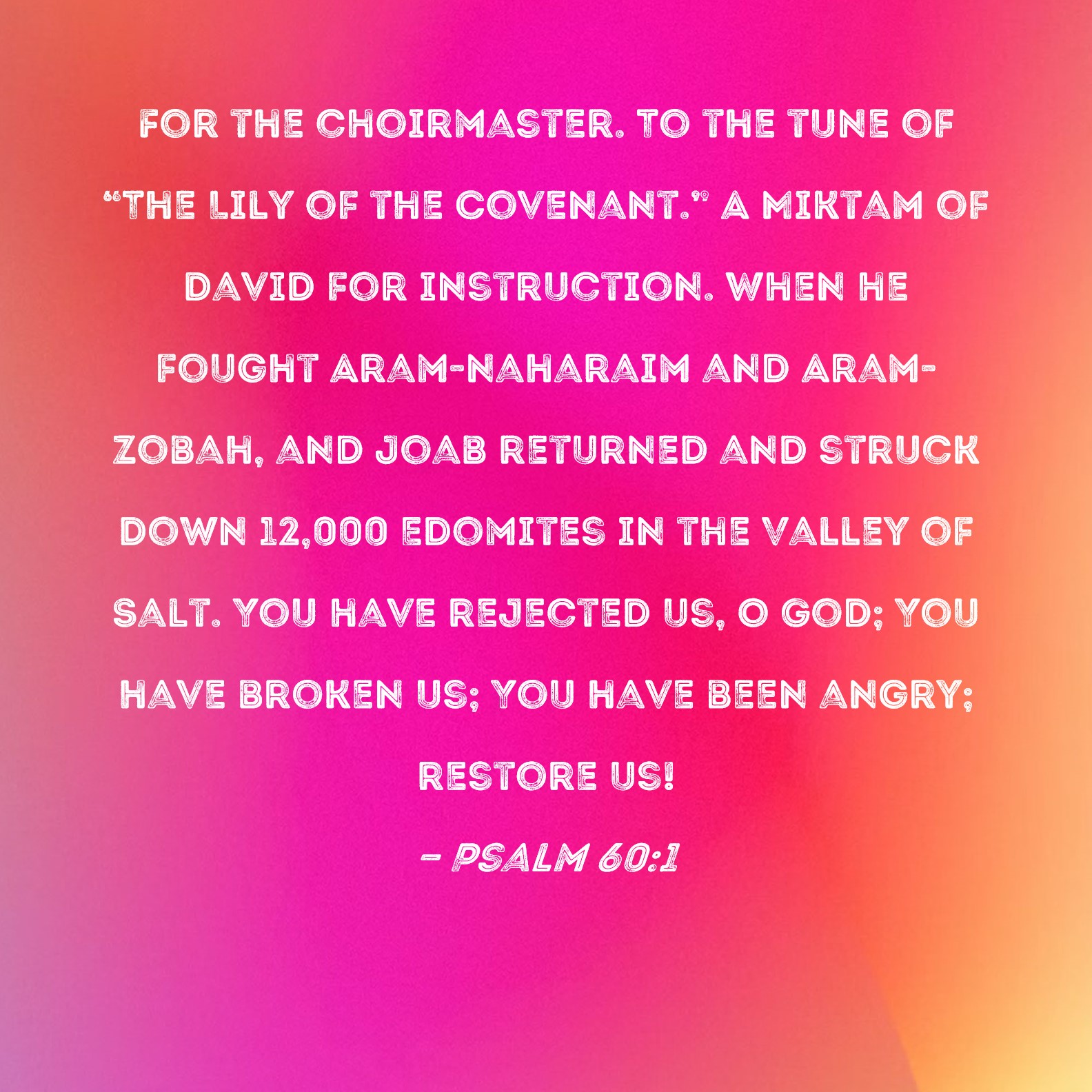 Psalm 60:1 For the choirmaster. To the tune of "The Lily of the Covenant." A Miktam of David for instruction. When he fought Aram-naharaim and Aram-zobah, and Joab returned and struck down 12,000 Edomites in the Valley of Salt. You have rejected us, O God; You have broken us; You have been angry; restore us!