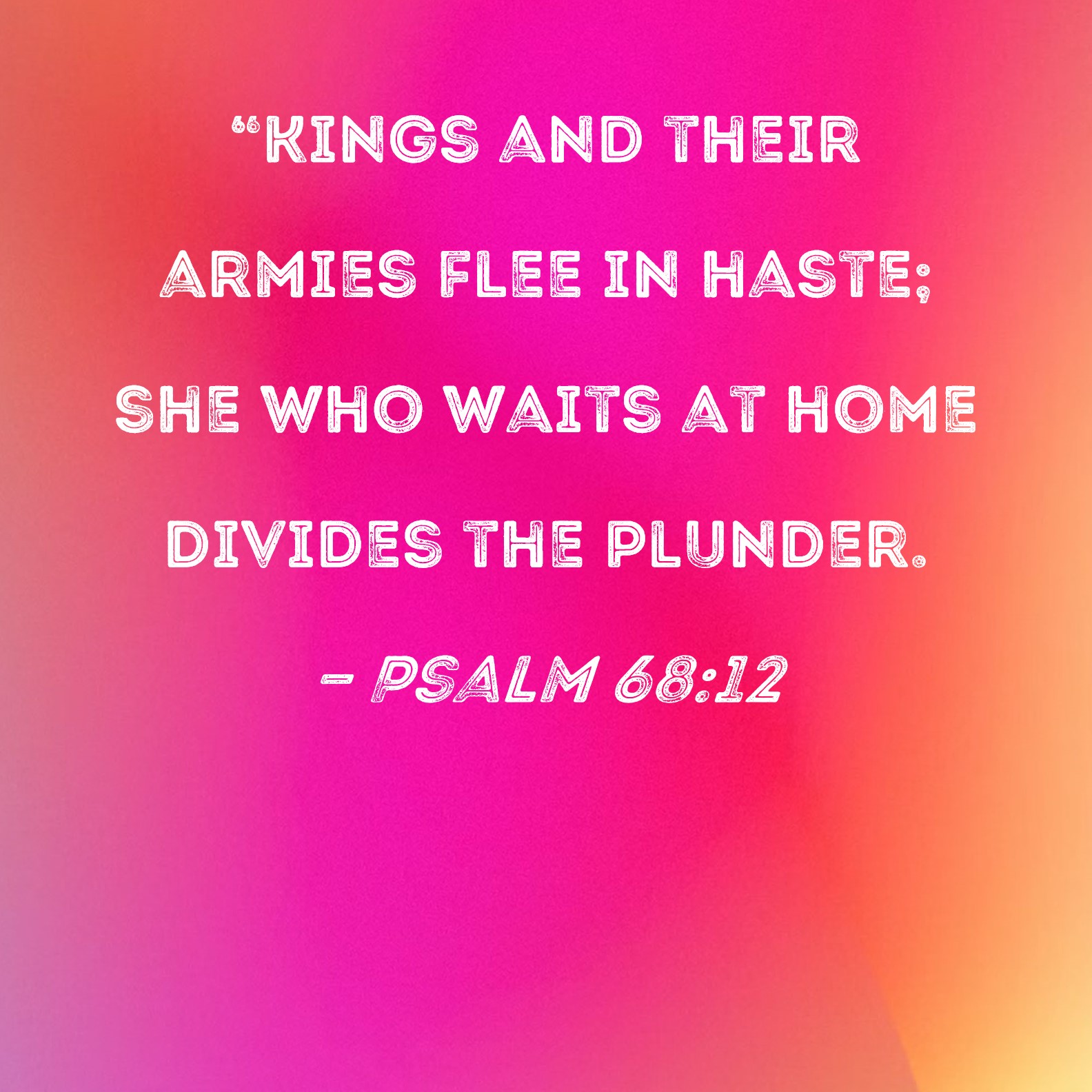 Psalm 68:12 "Kings and their armies flee in haste; she who waits at home divides the plunder.