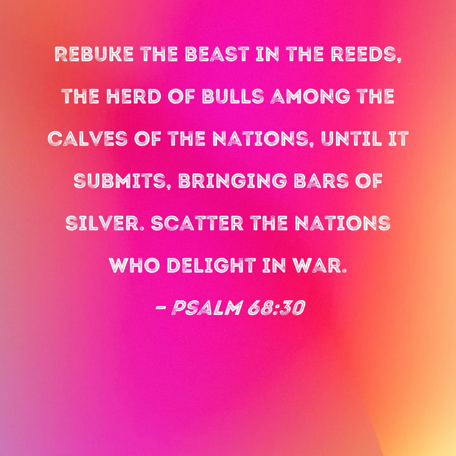 Psalm 68:30 Rebuke the beast in the reeds, the herd of bulls among the calves of the nations, until it submits, bringing bars of silver. Scatter the nations who delight in war.