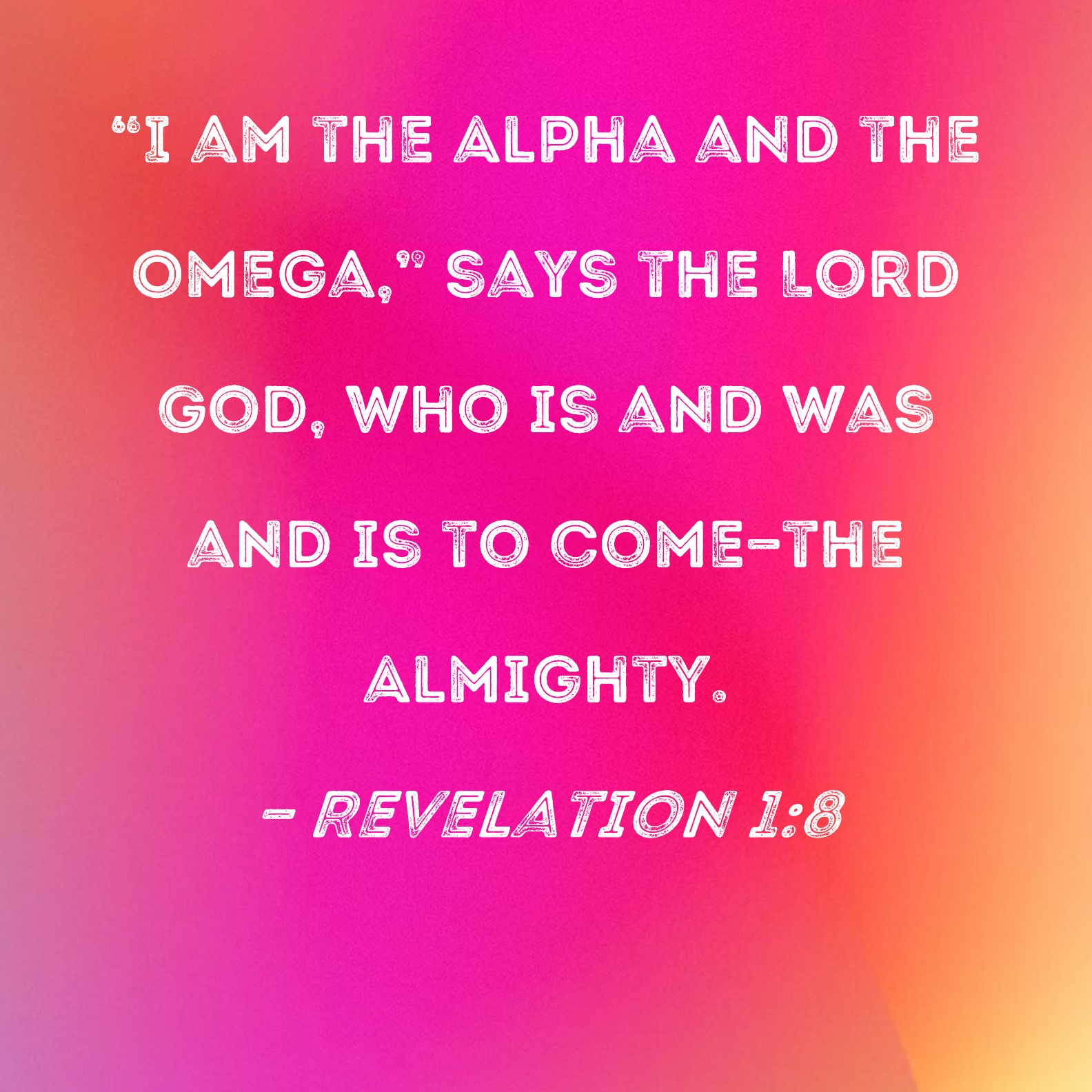 BSB: "I am the Alpha and the Omega," says the Lord God, who is and was and is to come--the Almighty. KJV: I am Alpha and Omega, the beginning and the ending, saith the Lord, which is, and which was, and which is to come, the Almighty. DRB: I am Alpha and Omega, the beginning and the end, saith the Lord God, who is, and who was, and who is to come, the Almighty. DBT: I am the Alpha and the Omega, saith the Lord God, he who is, and who was, and who is to come, the Almighty. ERV: I am the Alpha and the Omega, saith the Lord God, which is and which was and which is to come, the Almighty. WBT: I am Alpha and Omega, the beginning and the ending, saith the Lord, who is, and who was, and who is to come, the Almighty. WEB: “I am the Alpha and the Omega,” says the Lord God, “who is and who was and who is to come, the Almighty.” YLT: I am the Alpha and the Omega, beginning and end, saith the Lord, who is, and who was, and who is coming — the Almighty.'Links Revelation 1:8 NIV • Revelation 1:8 NLT • Revelation 1:8 ESV • Revelation 1:8 NASB • Revelation 1:8 KJV • Revelation 1:8 Interlinear • Revelation 1:8 Commentaries • Revelation 1:8 Parallel Texts • Revelation 1:8 Bible Apps • Revelation 1:8 Parallel • Bible Hub |