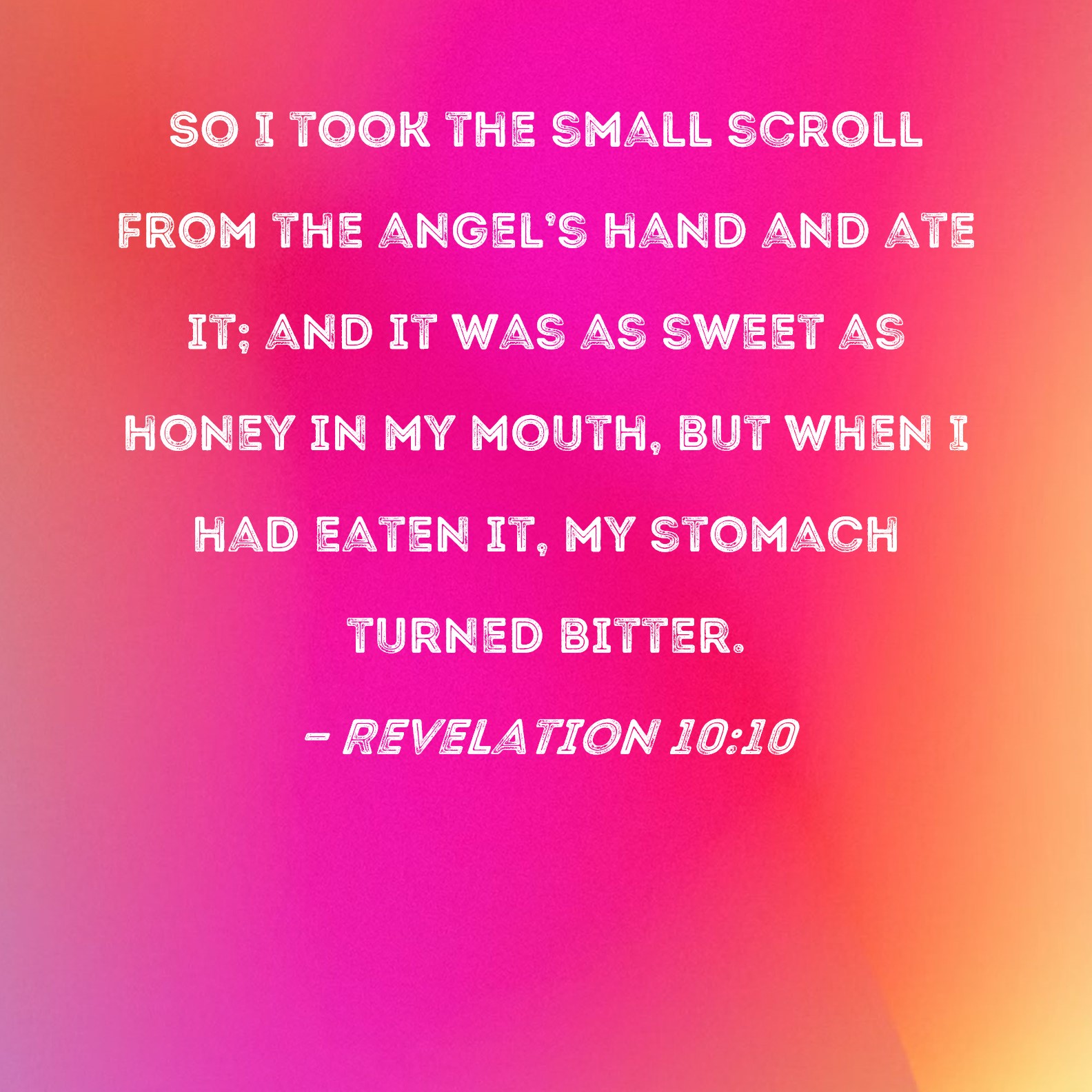 Revelation 10:10 So I took the small scroll from the angel's hand and ate it; and it was as sweet as honey in my mouth, but when I had eaten it, my stomach turned bitter.
