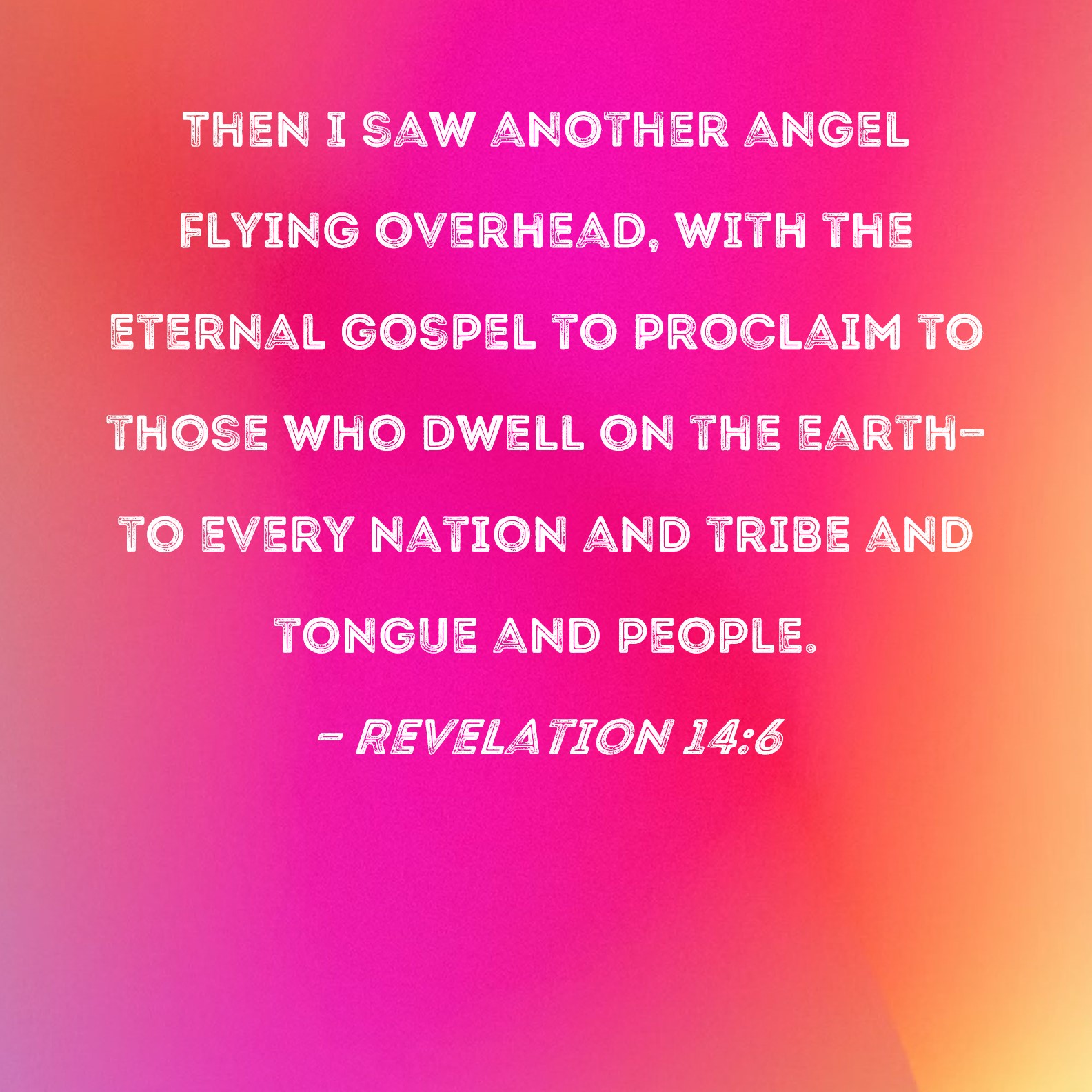 Revelation 14:6 Then I saw another angel flying overhead, with the eternal gospel to proclaim to those who dwell on the earth--to every nation and tribe and tongue and people.