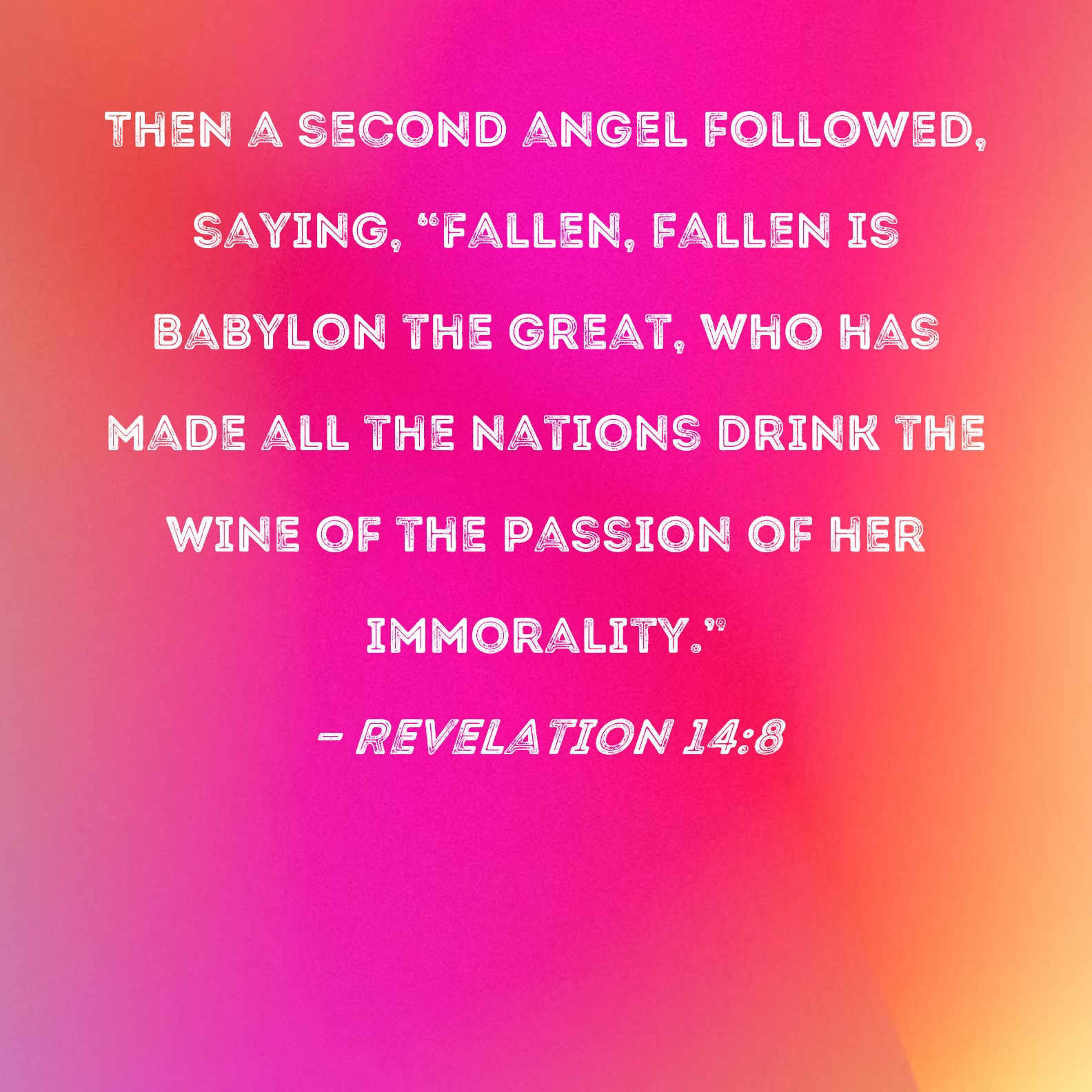 Revelation 14:8 Then a second angel followed, saying, "Fallen, fallen is Babylon the great, who has made all the nations drink the wine of the passion of her immorality."