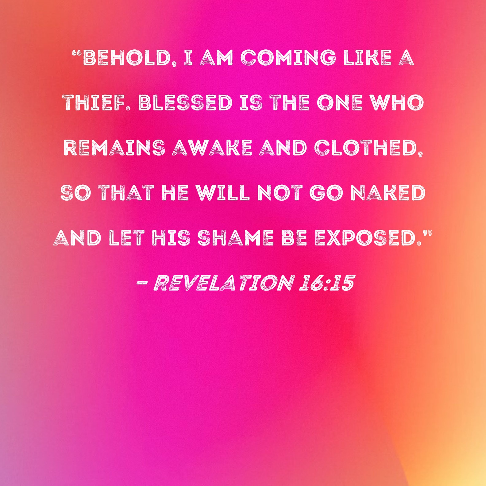 Revelation 16:15 "Behold, I am coming like a thief. Blessed is the one who remains awake and clothed, so that he will not go naked and let his shame be exposed."