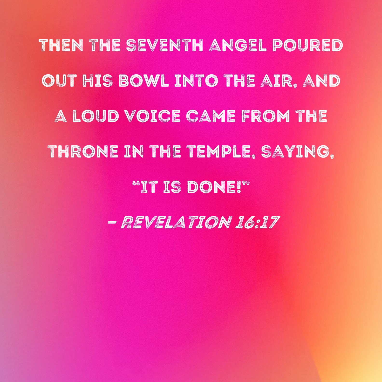 Revelation 16:17 Then the seventh angel poured out his bowl into the air, and a loud voice came from the throne in the temple, saying, "It is done!"