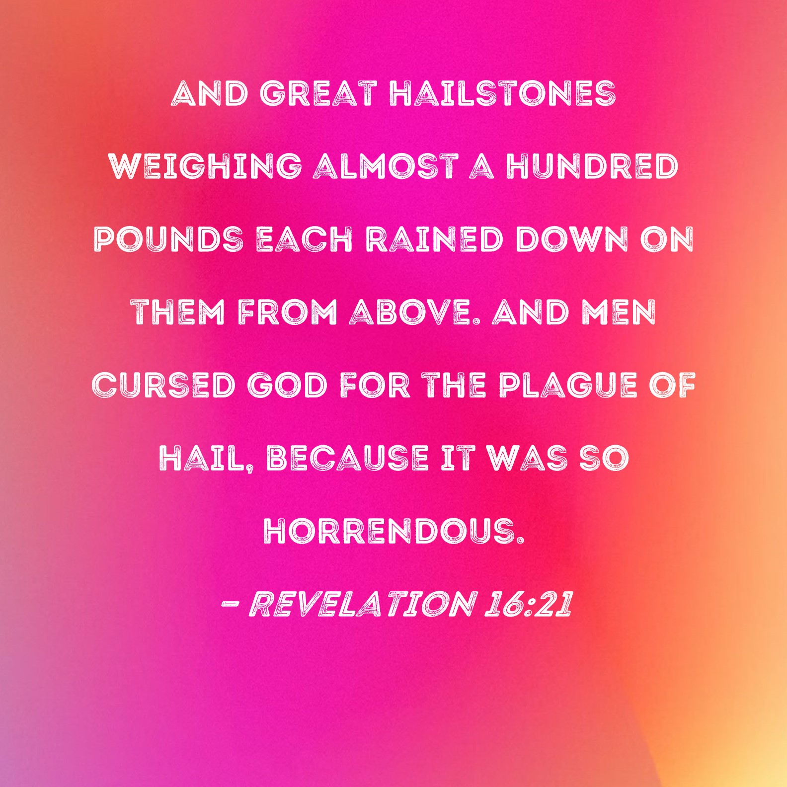 Revelation 16:21 And great hailstones weighing almost a hundred pounds each rained down on them from above. And men cursed God for the plague of hail, because it was so horrendous.