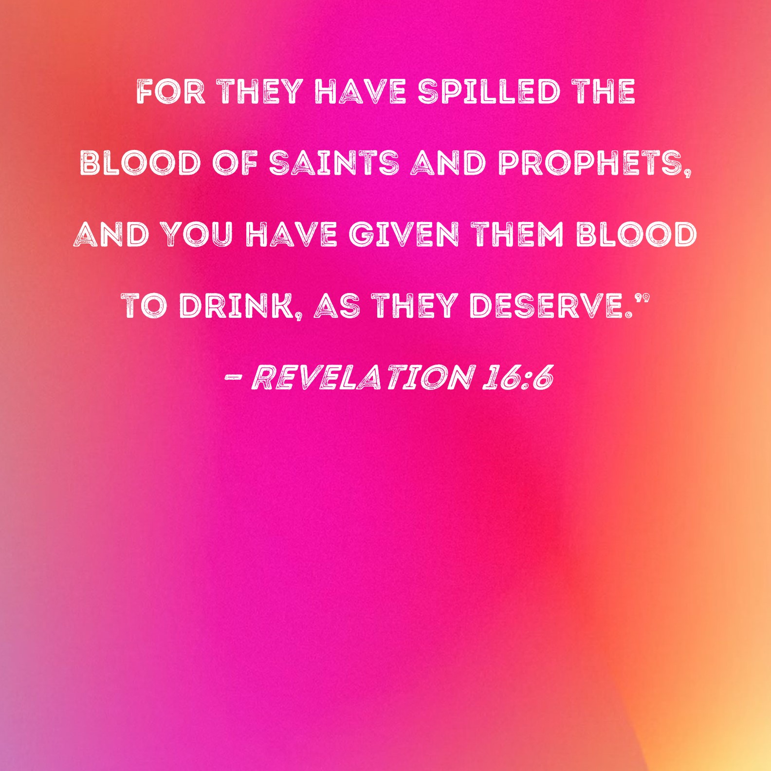 Revelation 16:6 For they have spilled the blood of saints and prophets, and You have given them blood to drink, as they deserve."