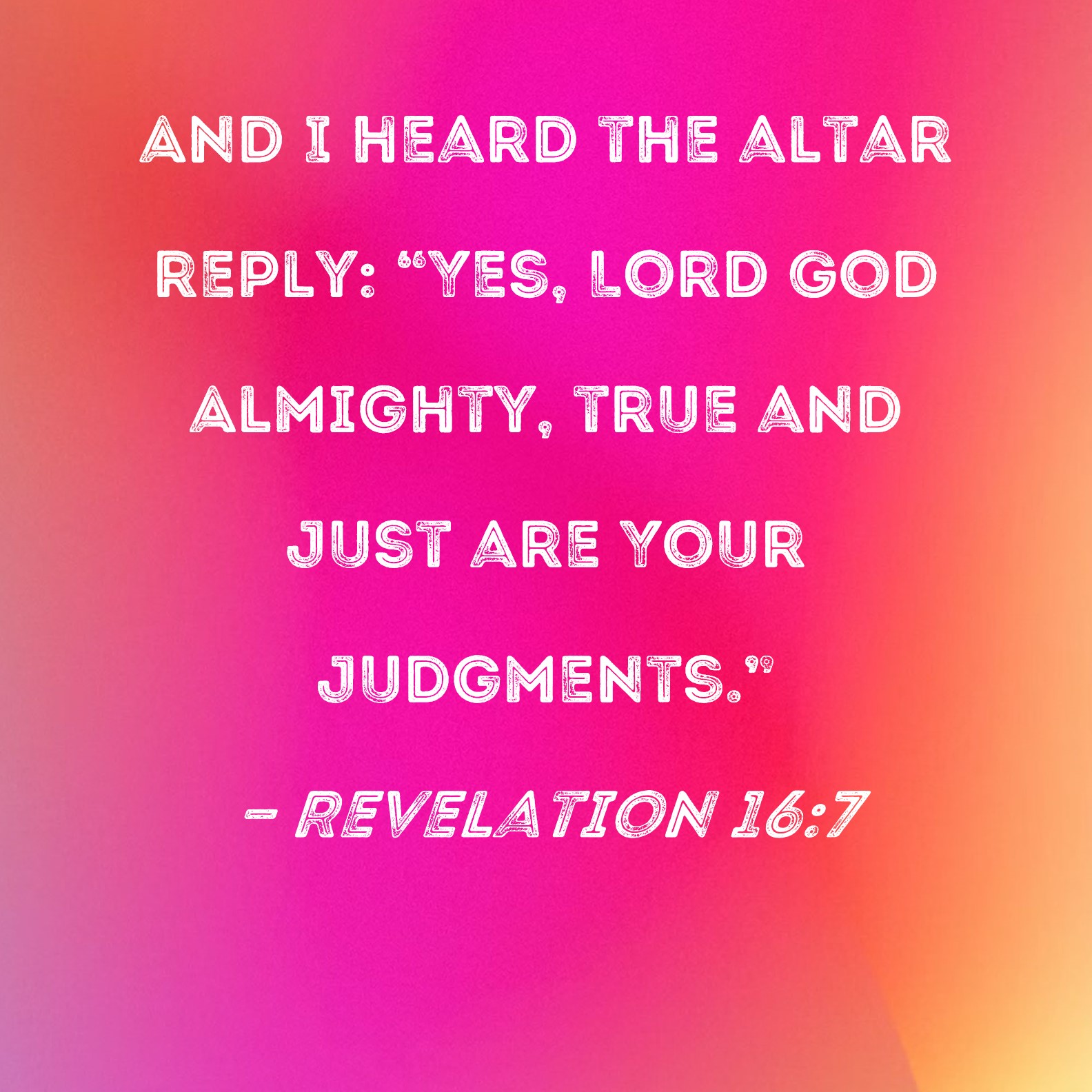 Revelation 16:7 And I heard the altar reply: "Yes, Lord God Almighty, true and just are Your judgments."