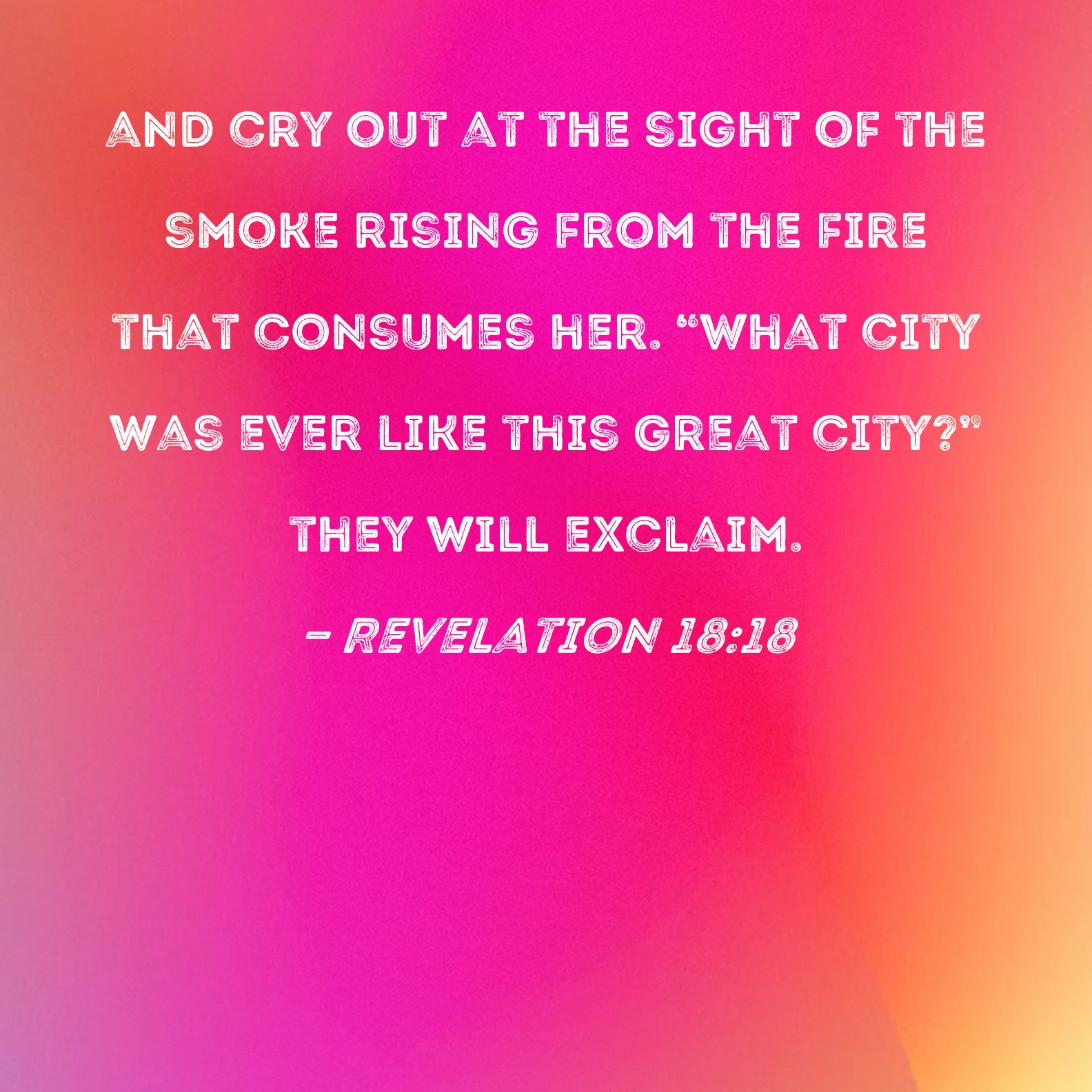 Revelation 18:18 and cry out at the sight of the smoke rising from the fire that consumes her. "What city was ever like this great city?" they will exclaim.