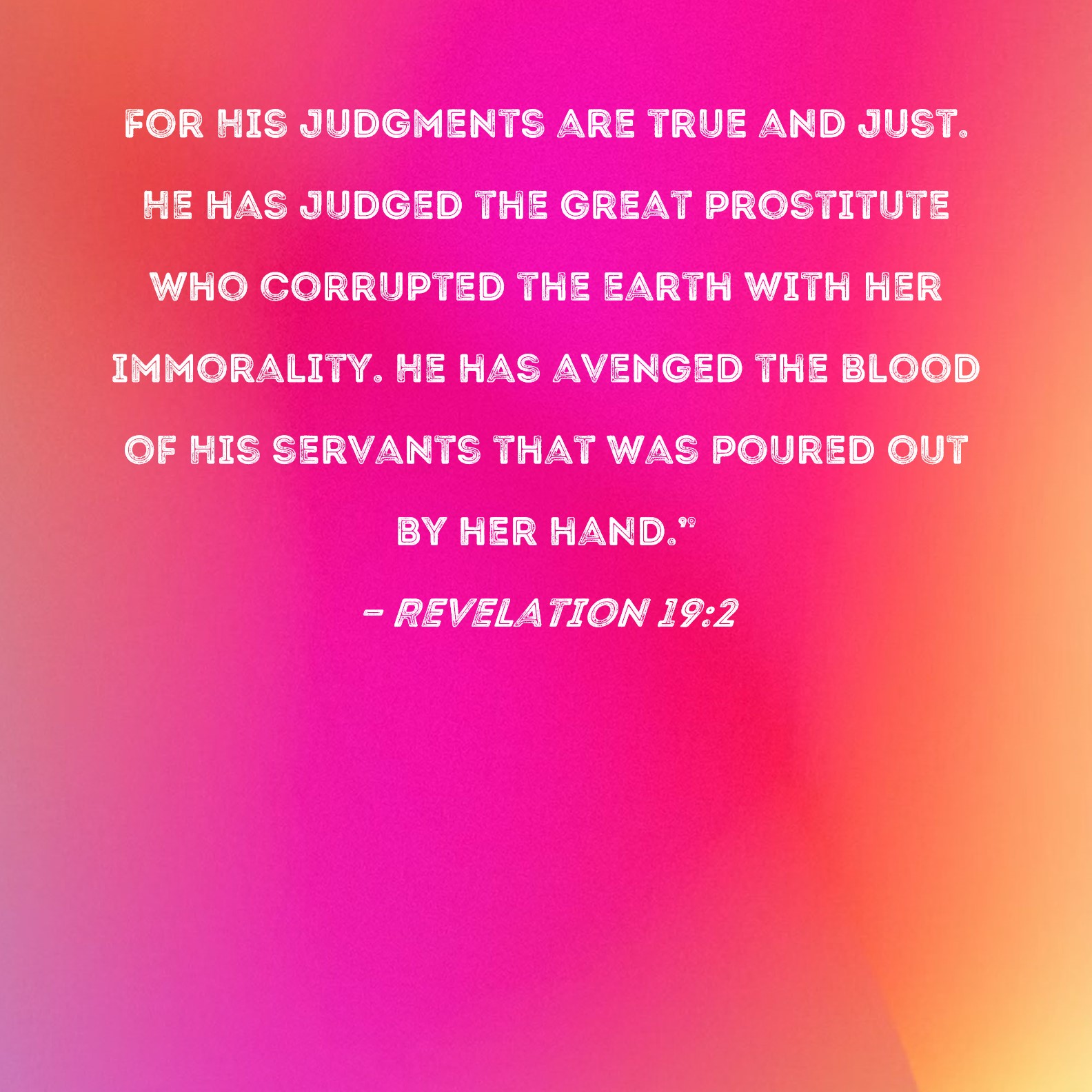 Revelation 19:2 For His judgments are true and just. He has judged the great prostitute who corrupted the earth with her immorality. He has avenged the blood of His servants that was poured out by her hand."