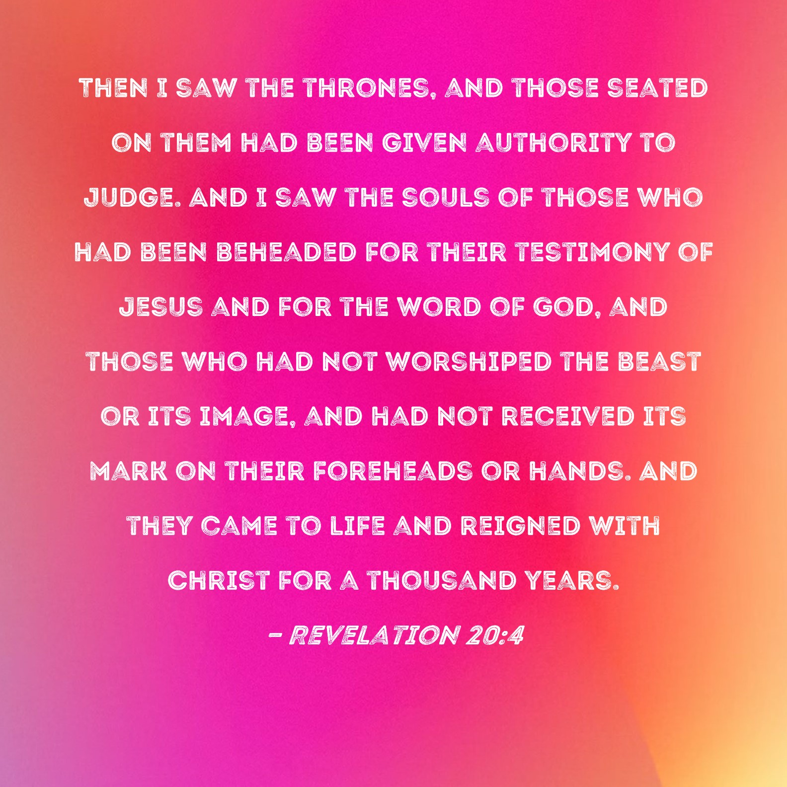Revelation 20:4 Then I saw the thrones, and those seated on them had been given authority to judge. And I saw the souls of those who had been beheaded for their testimony of Jesus and for the word of God, and those who had not worshiped the beast or its image, and had not received its mark on their foreheads or hands. And they came to life and reigned with Christ for a thousand years.