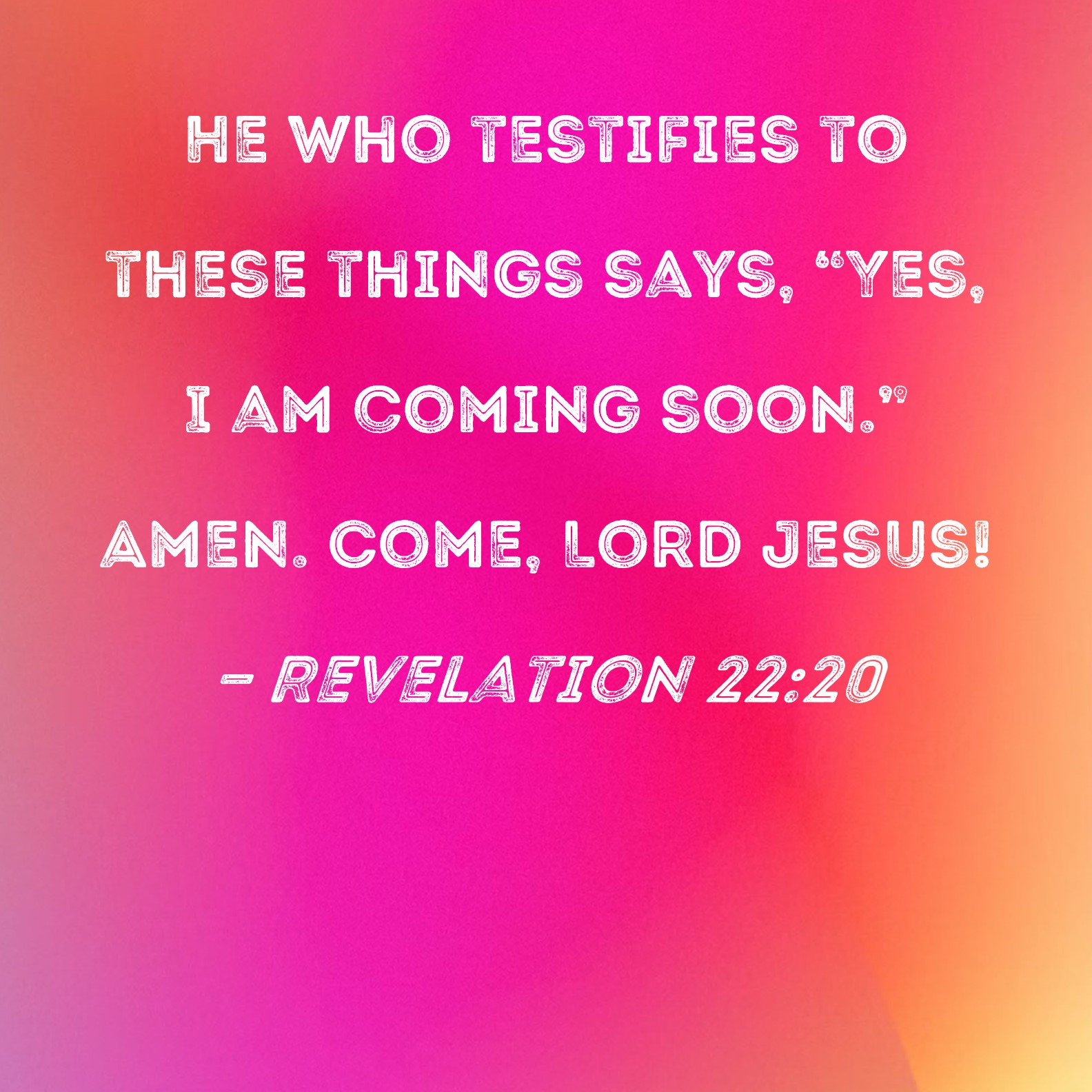 Revelation 22:20 He who testifies to these things says, "Yes, I am coming soon." Amen. Come, Lord Jesus!