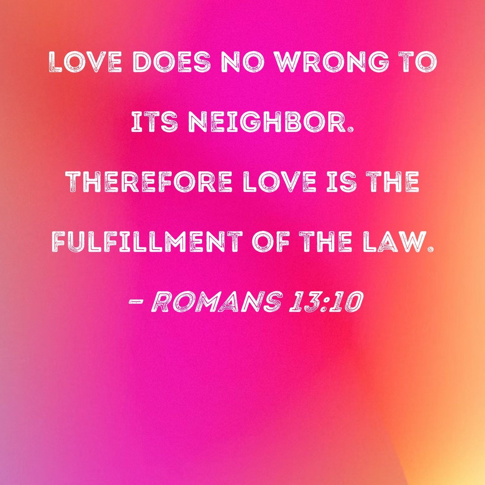 Romans 13:10 Love does no wrong to its neighbor. Therefore love is the fulfillment of the law.