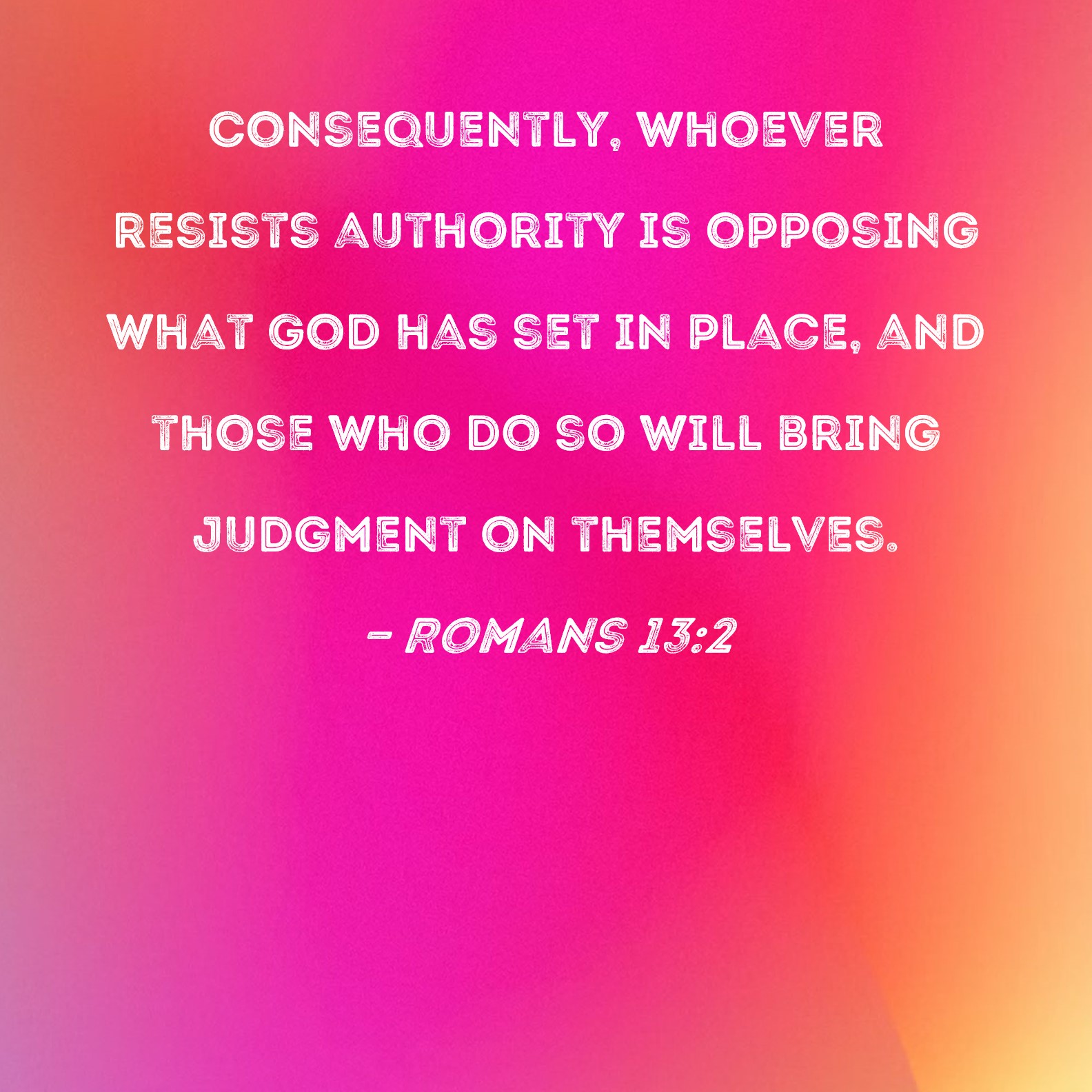 Romans 13:2 Consequently, whoever resists authority is opposing what God has set in place, and those who do so will bring judgment on themselves.