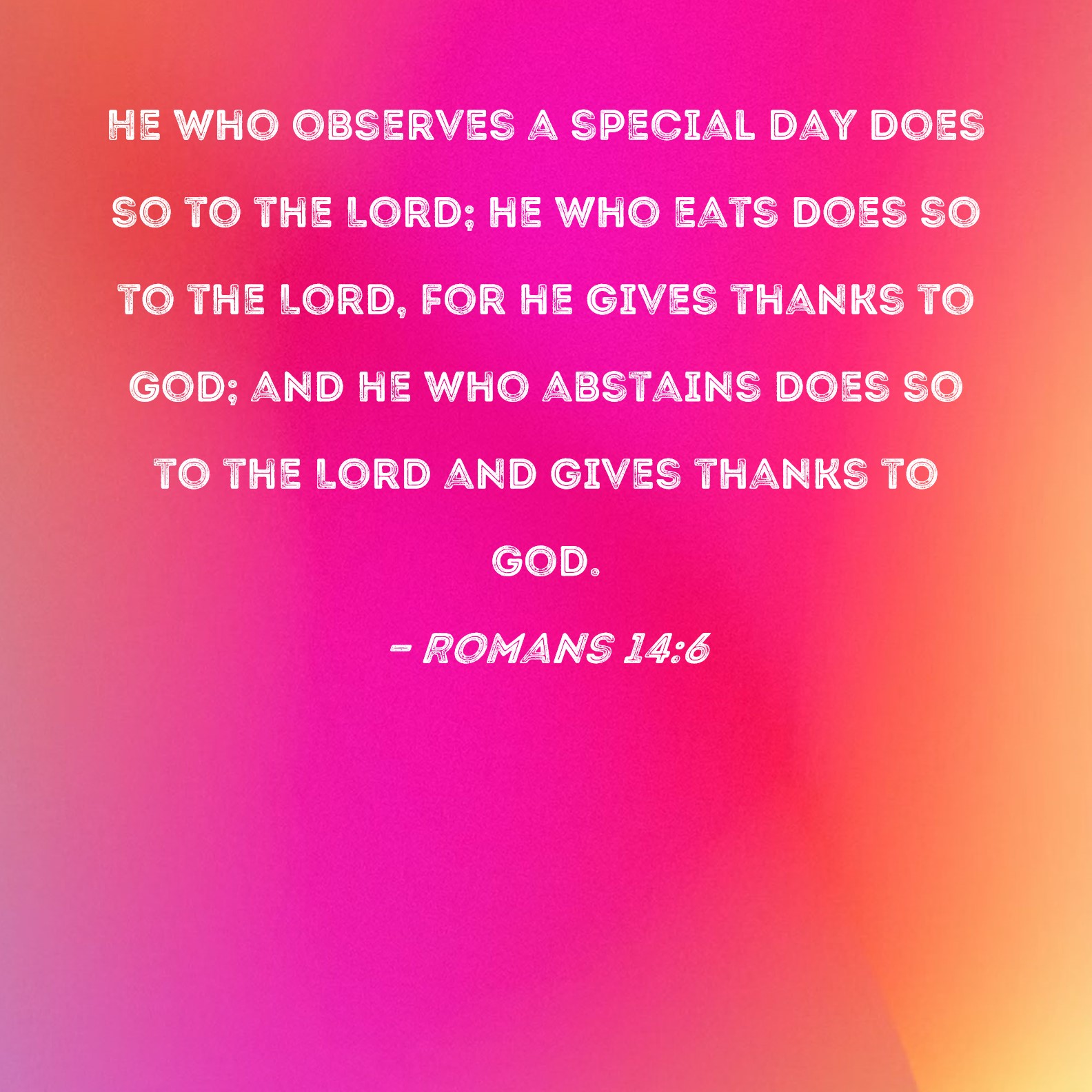Romans 14:6 He who observes a special day does so to the Lord; he who eats does so to the Lord, for he gives thanks to God; and he who abstains does so to the Lord and gives thanks to God.