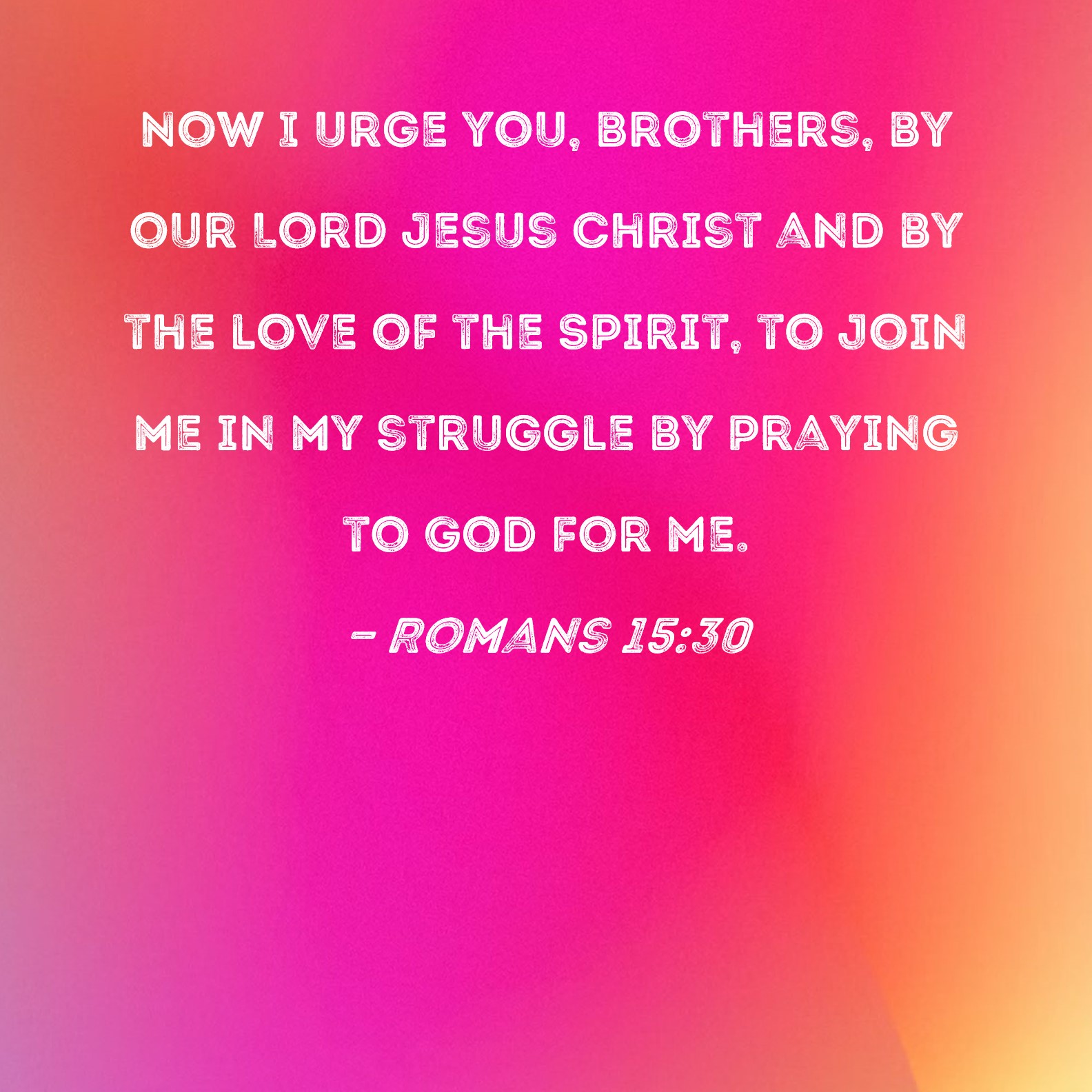 Romans 15:30 Now I urge you, brothers, by our Lord Jesus Christ and by the love of the Spirit, to join me in my struggle by praying to God for me.